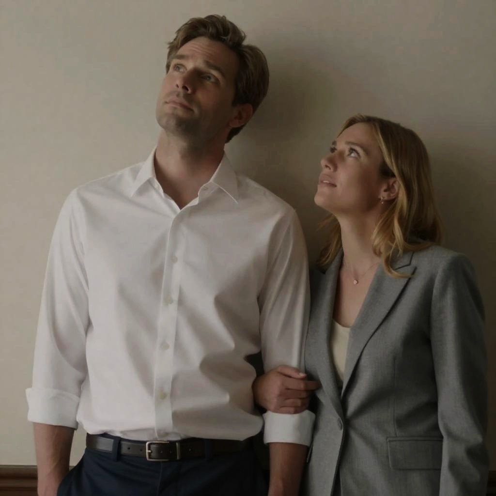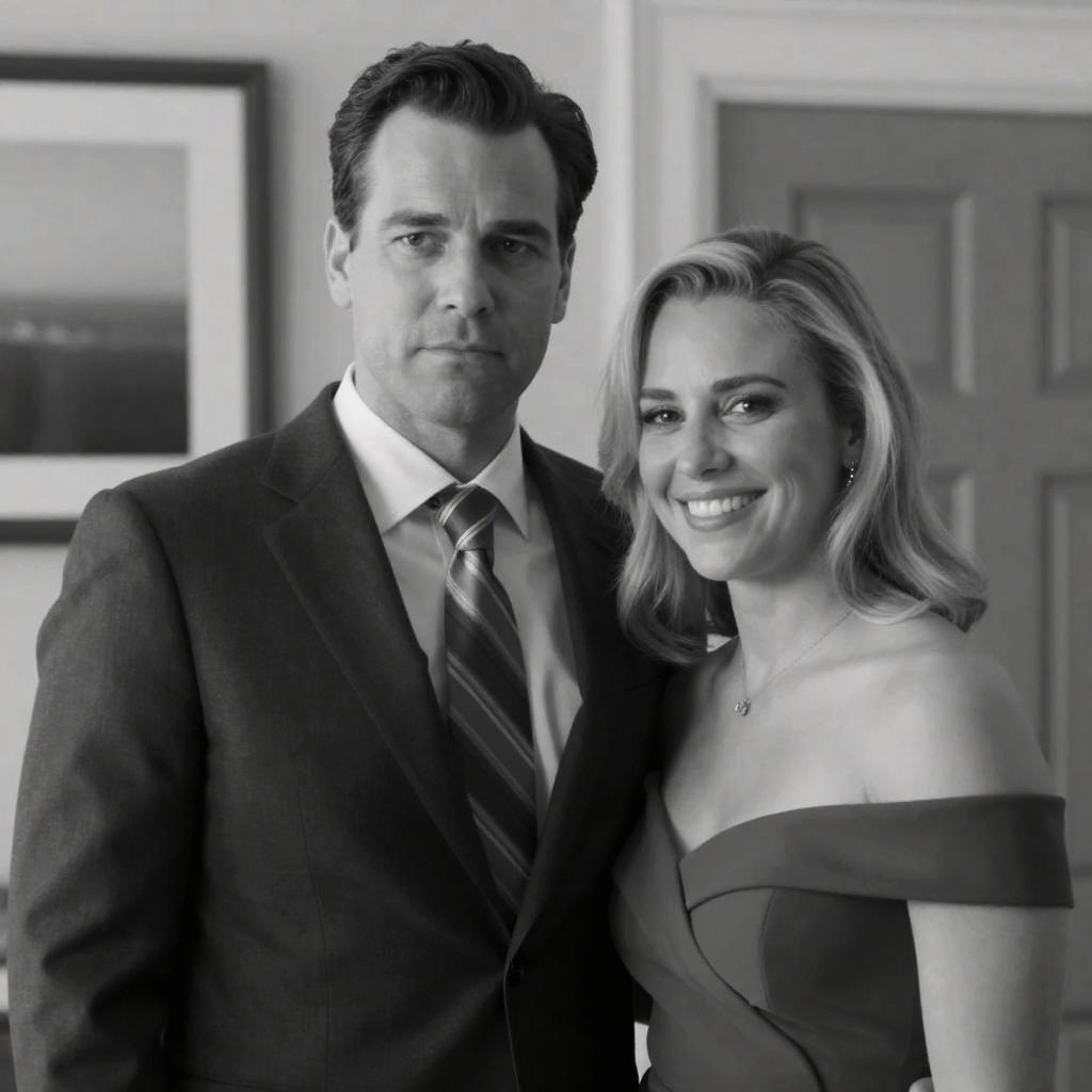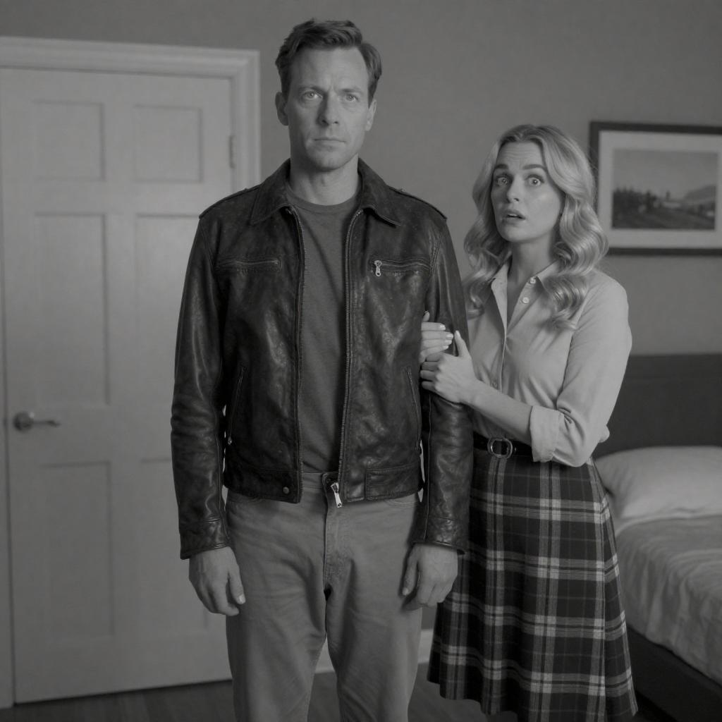 Black-and-white photograph of a man and woman in a room. Man in dark leather jacket, light pants, serious expression, standing. Woman with wavy blonde hair, plaid dress, light shirt, surprised expression, standing close, hand on man's arm. Door and bed in background.