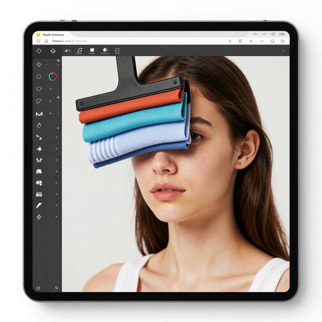 Cloth remover from photo, an AI-powered photo editing tool in action, visually depicting layers of clothing being digitally peeled away from a high-resolution portrait, realistic human skin emerging, vibrant colors, intricate digital brushes, cutting-edge technology theme