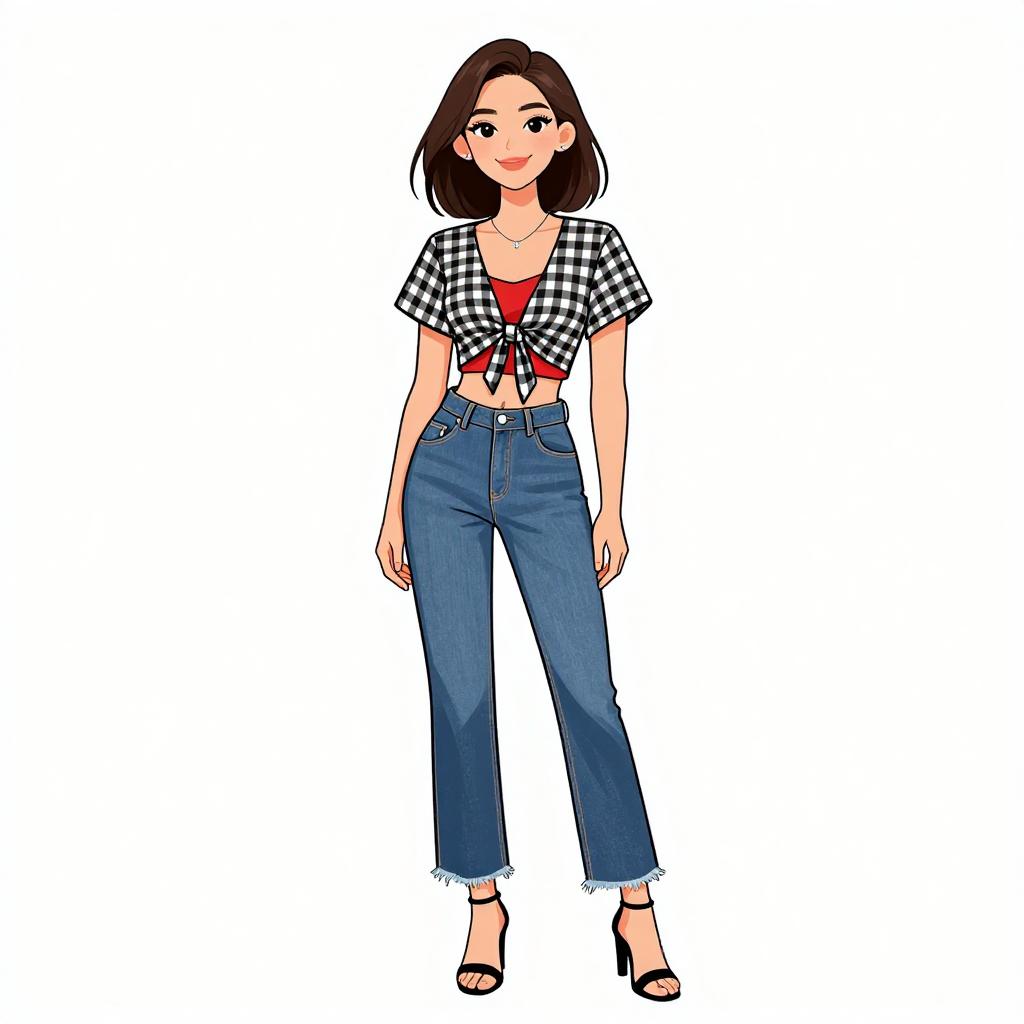 Woman with pretty face and pretty hair. smiling Woman, casual streetwear, cropped gingham print top in black and white, short sleeves with a front tie, layered over a red cropped tank top, high-waisted straight-cut denim jeans with frayed hems, open-toe black heeled sandals, minimalist silver necklace, white studio background. --sref 1467