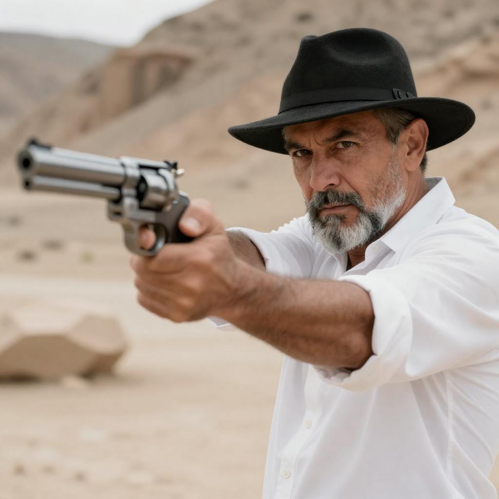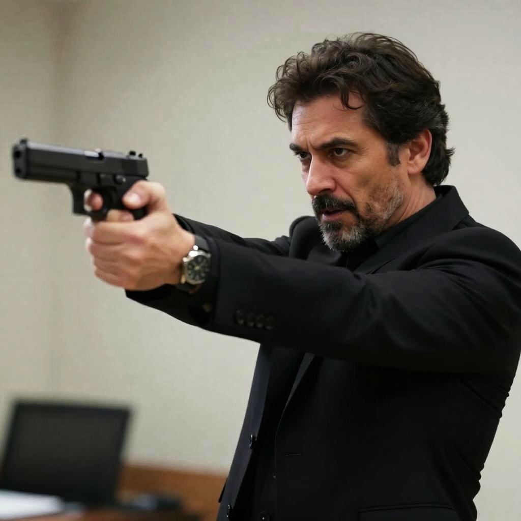 Photograph of a middle-aged man with short dark hair and a trimmed beard, wearing a beige coat over a gray shirt, pointing a handgun at the camera. He stands in a living room with a beige sofa, floral pillow, and glass coffee table. Sunlight streams through a window, casting shadows.