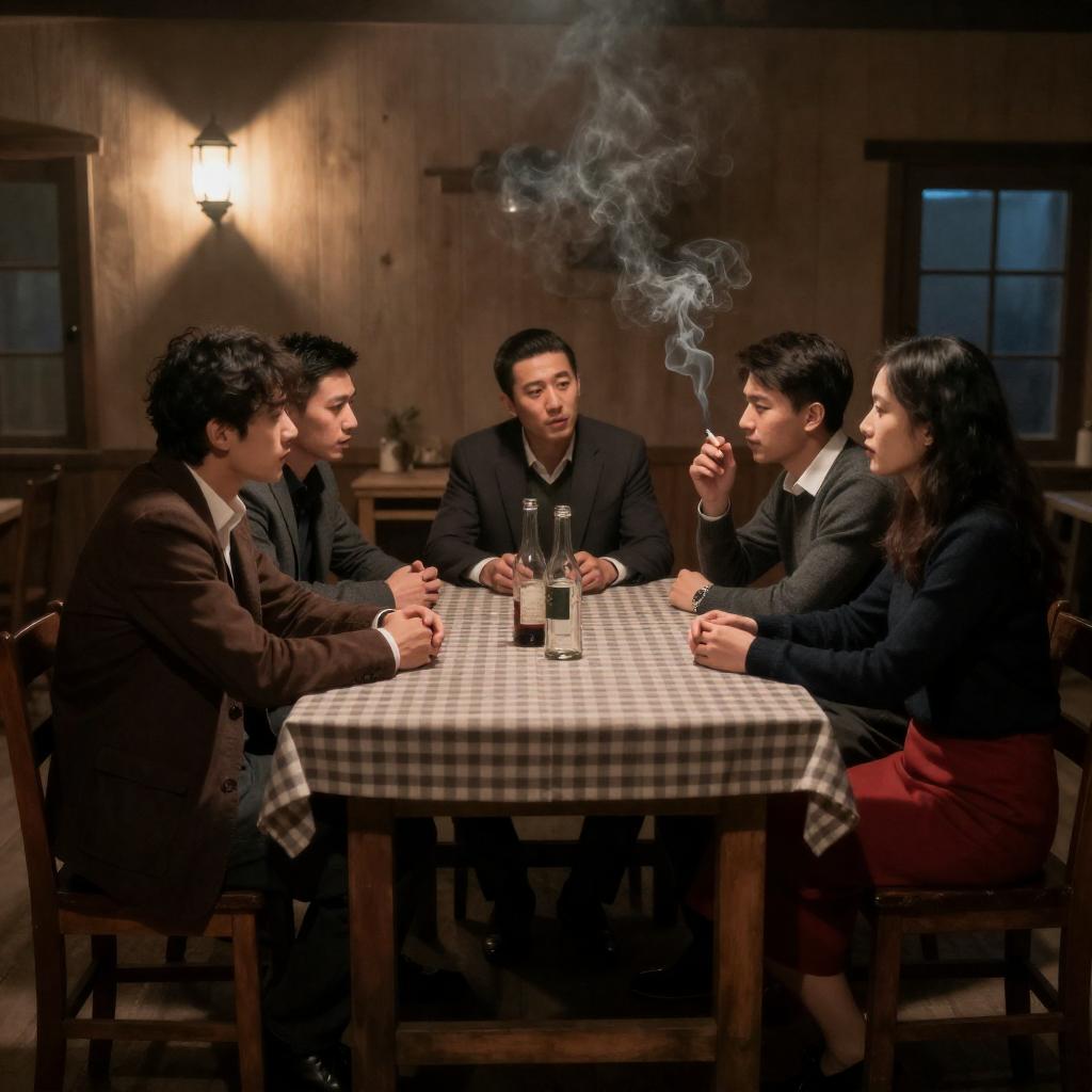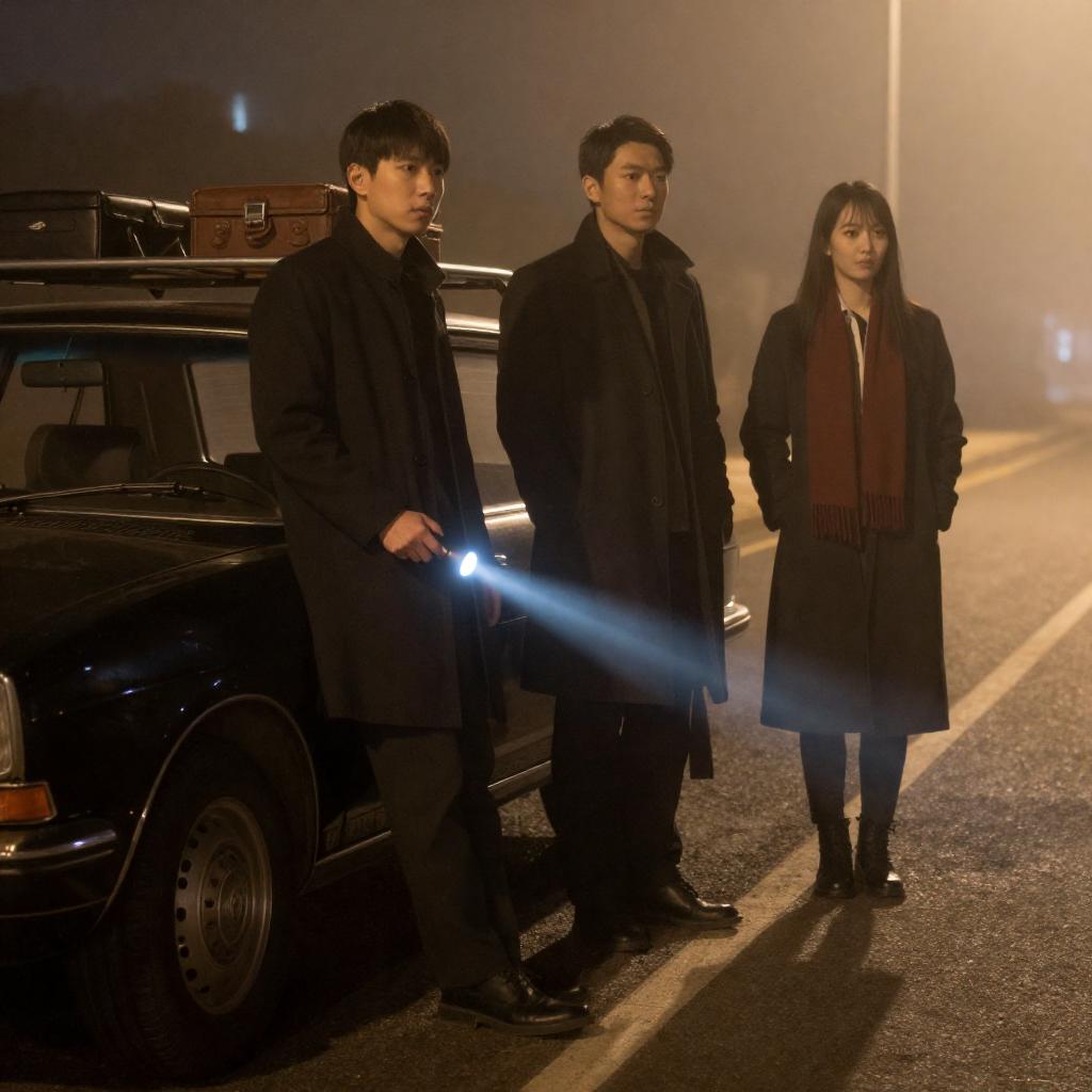 Nighttime photograph of three people standing beside a black vintage car with an open door. Two men in dark coats, one holding a flashlight, and a woman in a long coat with a scarf. Car has luggage on the roof. Foggy background with streetlights. The men have serious expressions. Woman's face partially obscured by fog.