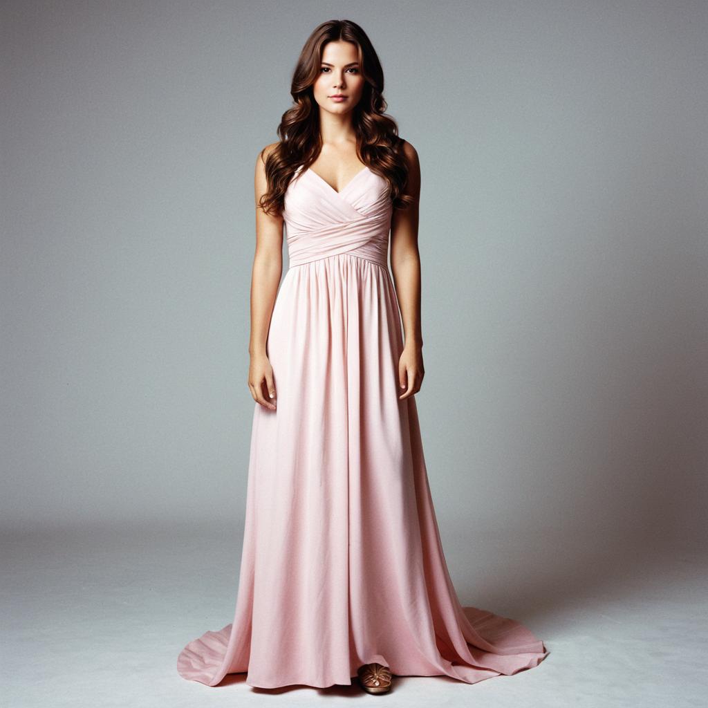 Hollywood wardrobe costume,1girl, solo, dress, brown hair, long hair, wavy hair, long dress, pink dress, full body, realistic, standing, white dress, sleeveless