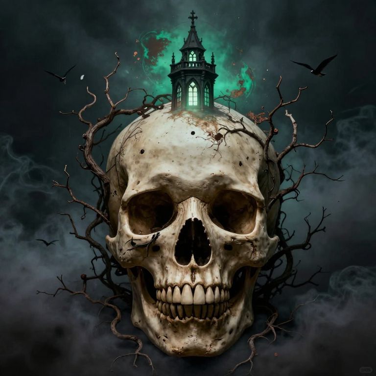 The image presents a haunting and surreal scene dominated by a large, detailed skull that serves as the central focal point. The skull, with its intricate bone structure and dark, earthy tones, is adorned with twisted vines and branches that seem to grow out of its eye sockets and mouth, creating a sense of organic decay. The skull is set against a moody, dark smoke-filled background, adding to the eerie atmosphere. Above the skull, a gothic-style tower emerges, its windows glowing with a soft, ethereal light that contrasts with the surrounding darkness. The tower is surrounded by a halo of malachite green and rust-colored flakes, further enhancing the surreal and otherworldly quality of the scene. The overall composition is balanced, with the skull and tower positioned centrally, while the dark smoke and scattered birds add depth and movement to the image. The use of light and shadow, along with the intricate details of the skull and the tower, creates a visually rich and complex scene that invites the viewer to explore its many layers.