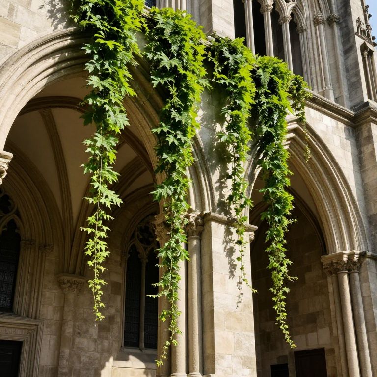 Photograph of a Gothic-style stone archway adorned with lush, green ivy cascading down the columns. The archway features intricate carvings and pointed arch windows with dark, rectangular panes. Sunlight filters through the ivy, highlighting its vibrant leaves and casting shadows on the beige stone. The texture of the stone is rough and weathered, contrasting with the smooth, bright green of the ivy. The background showcases the tall, vertical stone columns characteristic of Gothic architecture. The image captures a serene, historic ambiance in a sunlit, outdoor setting.
