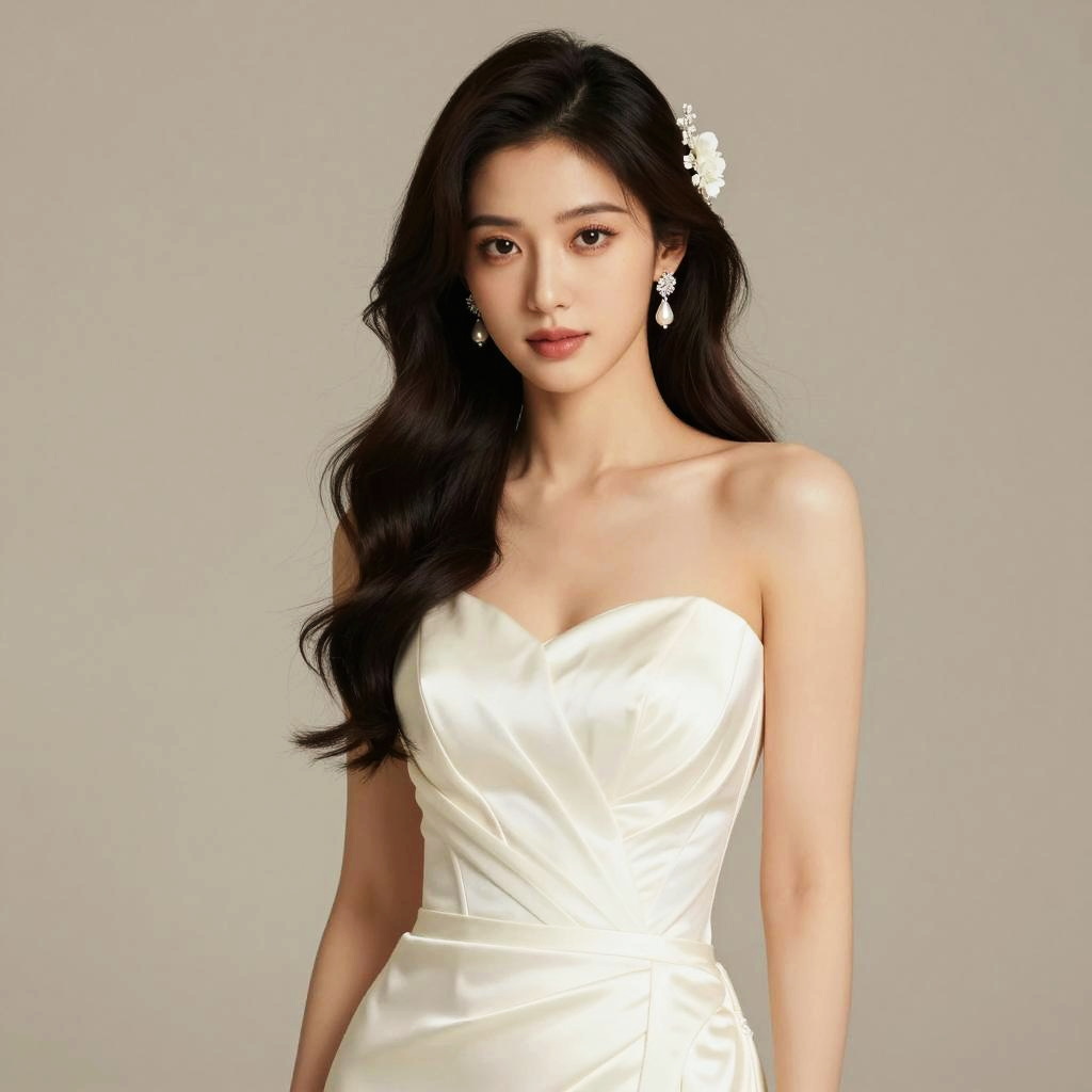 Photograph of an Asian woman with fair skin and black hair in an elegant, sleeveless white wedding dress with a flowing train, standing on a dark wooden staircase with ornate iron railings. She smiles, wearing beige heels, with a richly decorated background featuring gold and red accents.