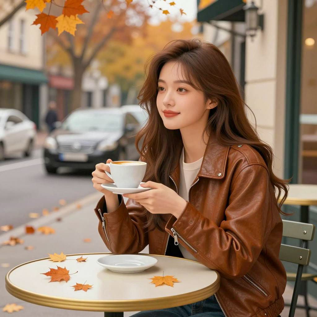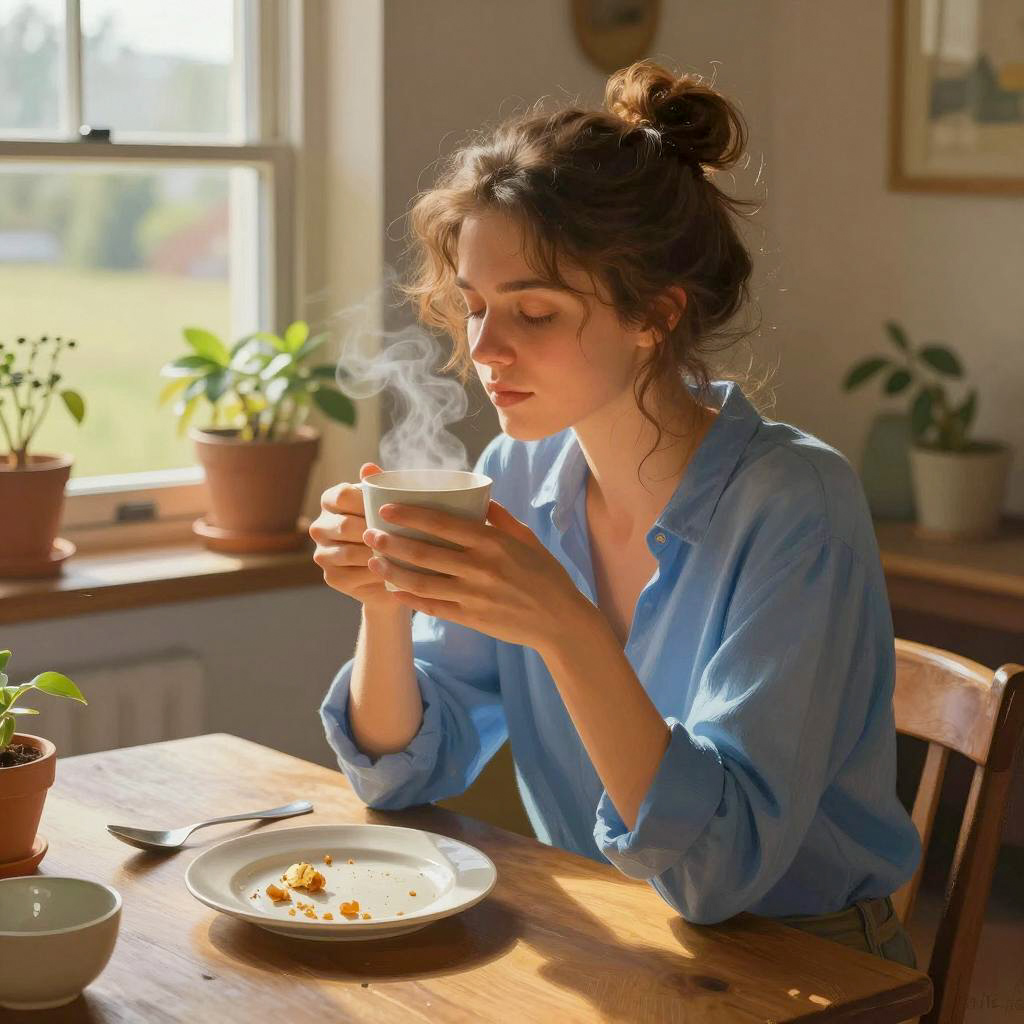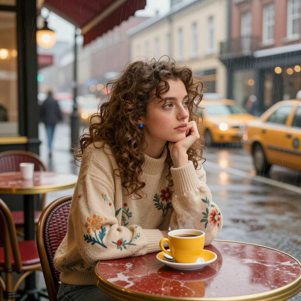 Digital illustration of a young woman with messy brown hair, wearing a yellow fur-trimmed coat, sitting at a café table. She rests her head on her hand, looking out the window. Rainy street outside with wet buildings and umbrellas. Table has a green teacup, saucer, small plate with a pastry, and a vase with yellow flowers. Warm indoor lighting contrasts with cool outdoor colors. Artist's in bottom right corner.
