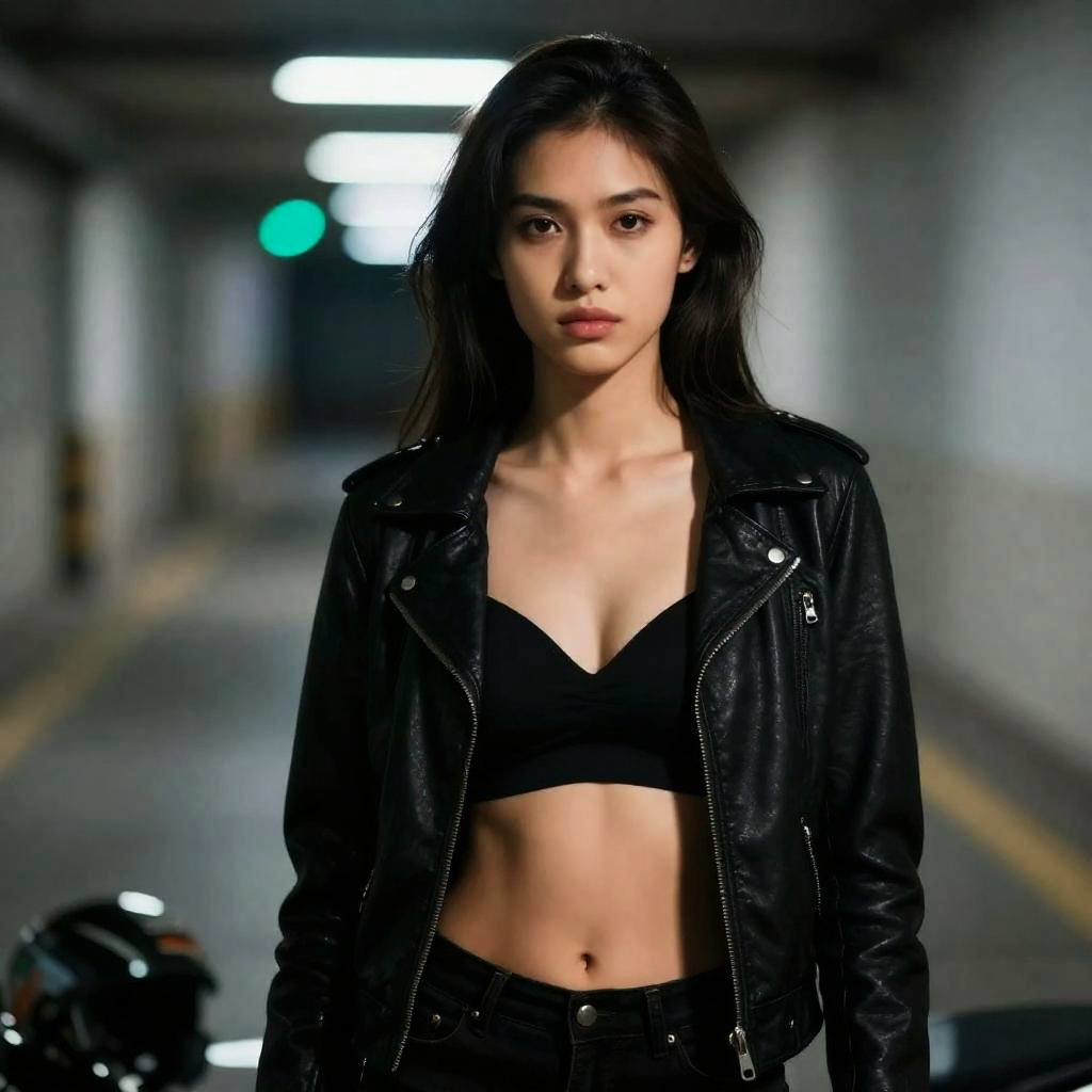 Photograph of a young woman with long, straight black hair, wearing a white, fitted t-shirt and dark blue jeans. She has a confident expression, with a gold wristwatch on her left wrist and a lanyard with an ID card hanging from her jeans. The background is blurred, with bright lights and indistinct figures.