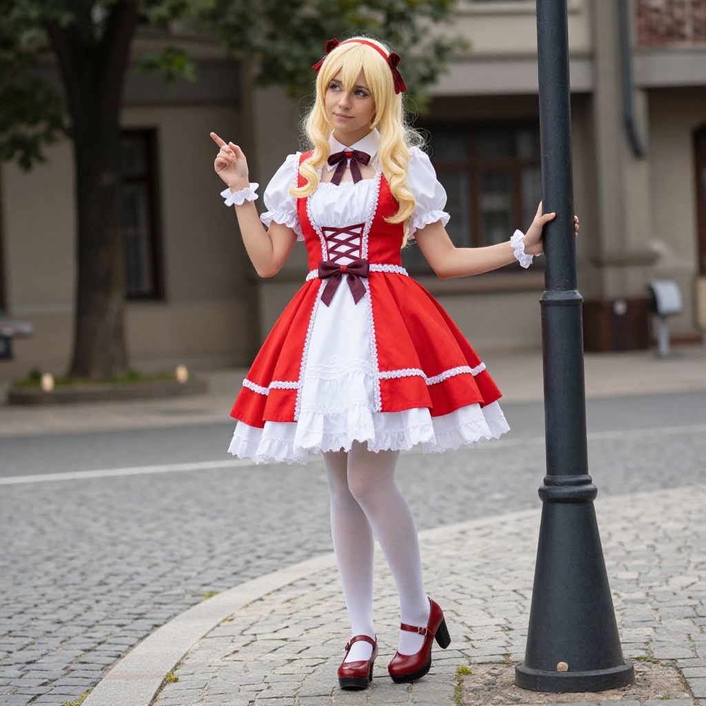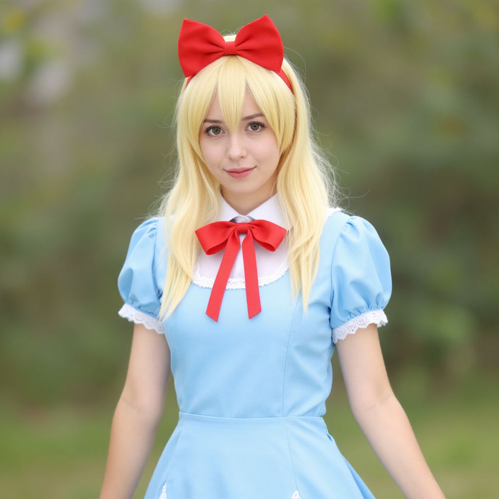 Photograph of a blonde woman in a light blue Alice in Wonderland-style dress with red bow and ribbon, standing outdoors against a blurred green background.