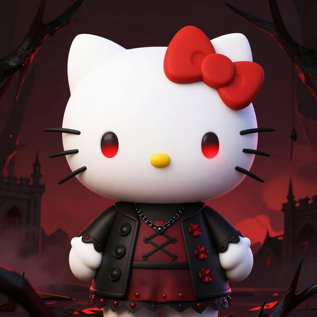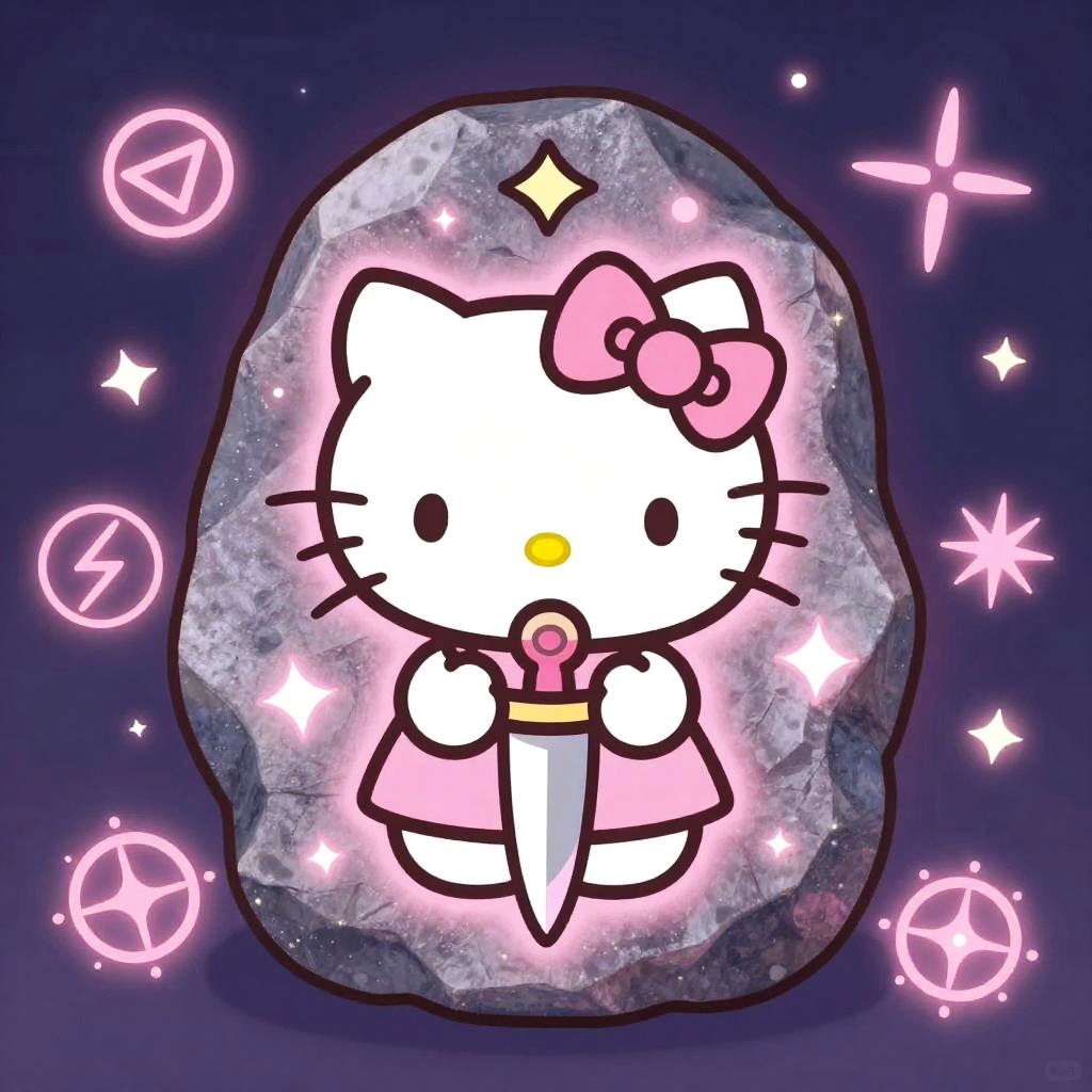 Hello Kitty dagger resting on a velvet cushion, ornate handle decorated with Hello Kitty motifs, stylized cartoon style, soft lighting, elegant and cute weapon design