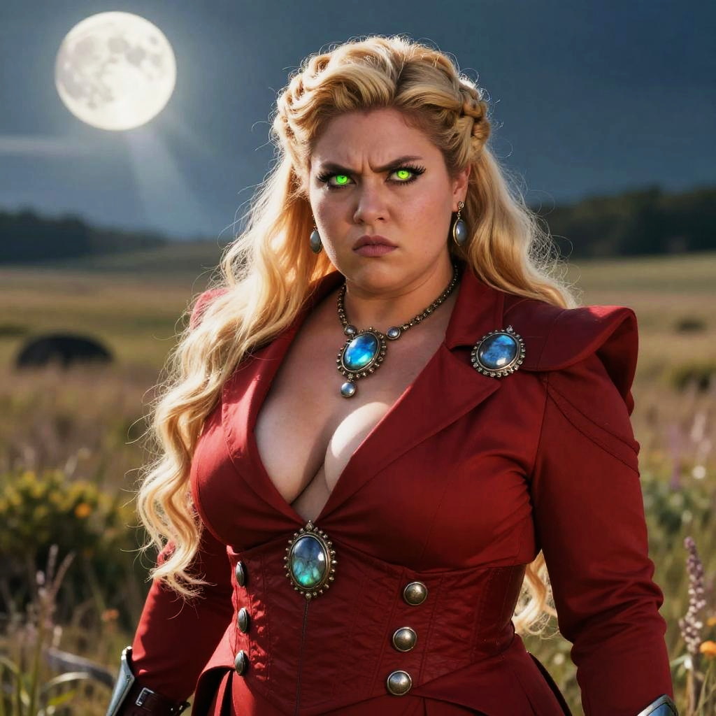 Portrait of a plus-size Paraguayan adult woman with natural large breasts and long blonde beehive hairstyle, wearing a detailed red suit outfit with armored dress accents and moonstone jewelry. She has glowing green-yellow pupils and an irate expression, standing in a boreal steppe under a bright full moon. The scene features rich moonlight, god rays, depth of field, and cinematic hard lighting with realistic shadows and vivid colors.