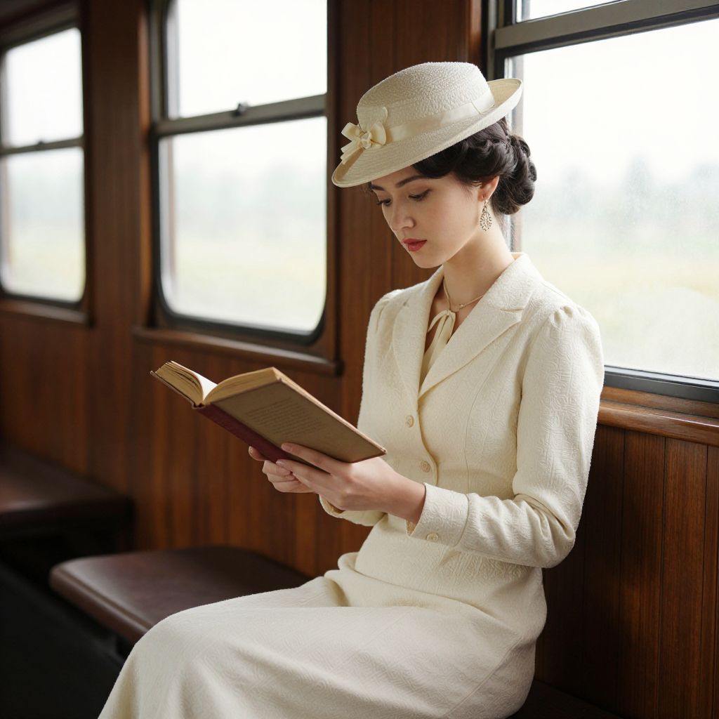 Elegant young woman engrossed in reading a book while seated by the window in a vintage railway train's wooden-paneled coupe, dressed in a cream-colored early 20th-century dress and complemented by a matching hat and dangling earrings.