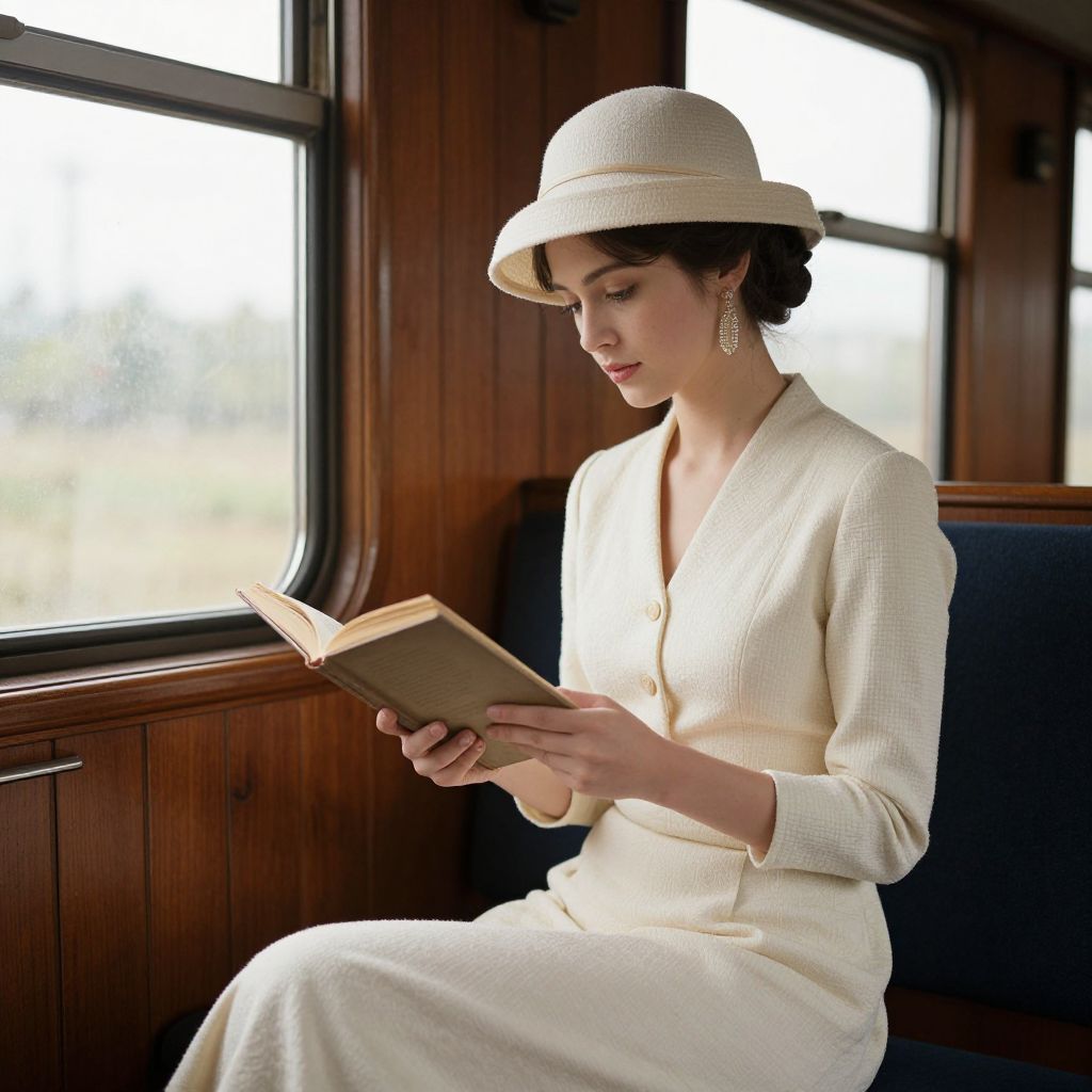 Photograph of a young woman with fair skin and dark, short, wavy hair, seated in a vintage train carriage. She wears a cream-colored, textured, long-sleeved suit with a deep V-neck and a matching wide-brimmed hat. She is reading a brown book, held with both hands, and has large, gold, dangling earrings. The background features wooden paneling and large windows with frosted edges, allowing diffused natural light to enter. The woman is seated on a dark blue cushioned seat, with a serene and focused expression. The overall style evokes a mid-20th century aesthetic.