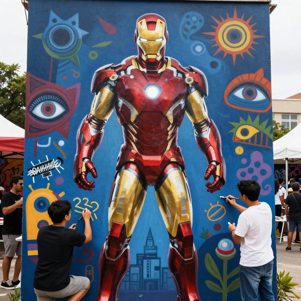 Realistic photo.Vanilla Iron Man with artists in a colorful street art festival where they are creating murals, highly detailed, super complex background, epic scene. realistic photo