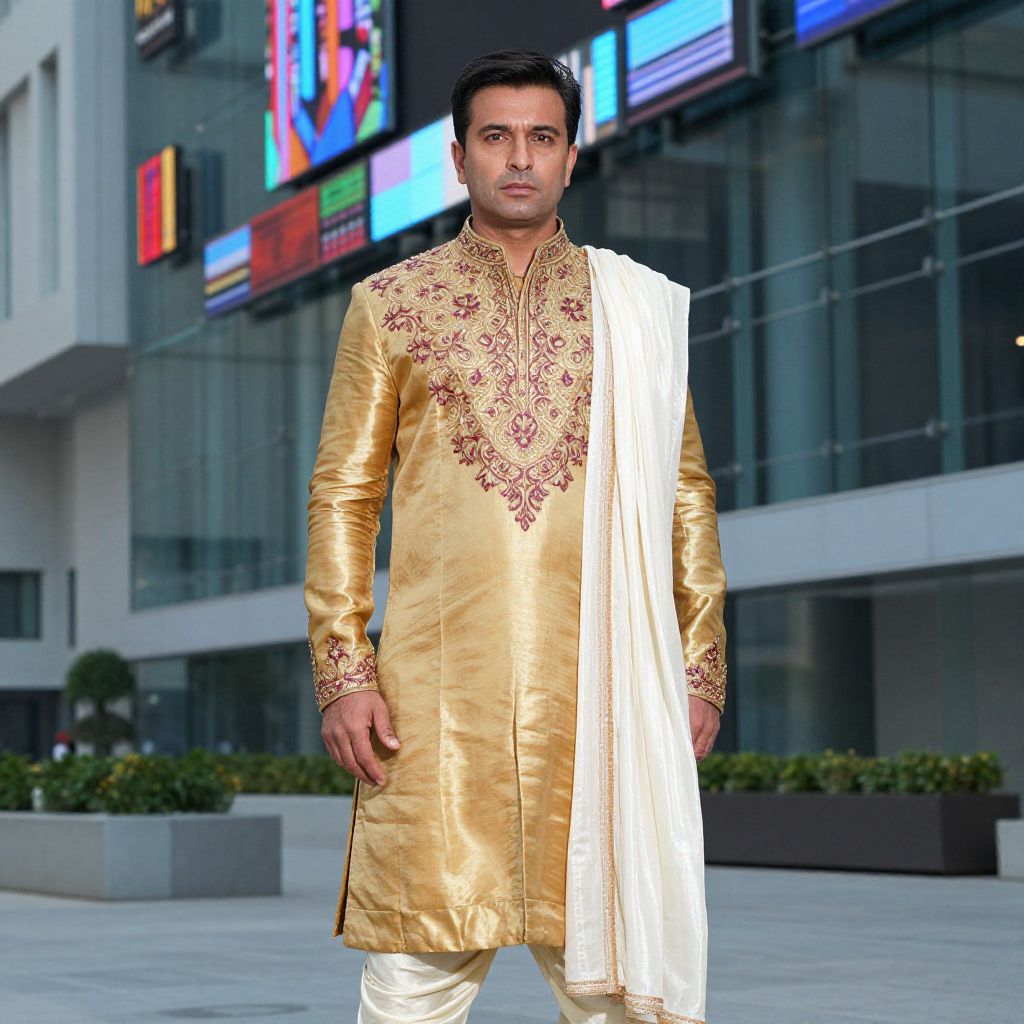 A man, rich gold silk sherwani, intricate maroon embroidery, matching churidar pants, elegant cream silk dupatta, modern glass building, overhead shot, confident expression, vibrant digital screens in background. Man has masculine face and piercing eyes