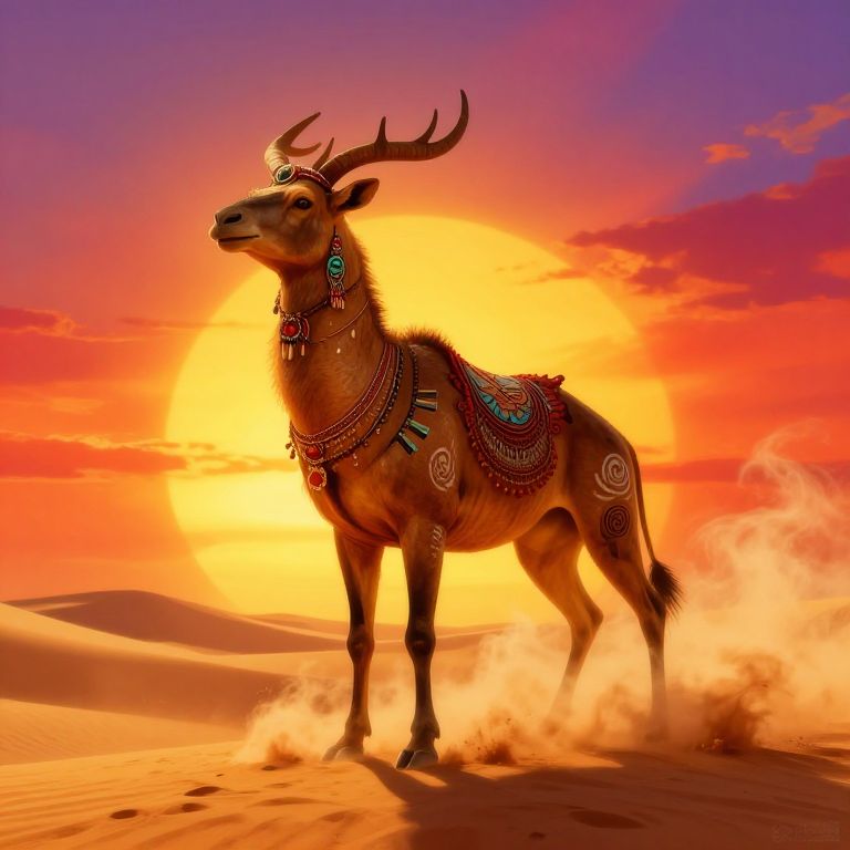 Camltoe as a fantastical desert animal, adorned with tribal jewelry and painted markings, standing tall on golden sand dunes under a blazing sunset sky, swirling dust clouds, vibrant colors, digital painting with strong contrasts and dynamic composition
