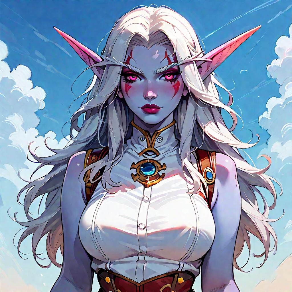Score_9, score_8_up, score_7_up, score_6_up, score_5_up, 1990s \(style\) cowboy shot, nelfazshara, night elf, colored_skin, blue skin, yellow eyes, azsoutfit, large breasts, white hair