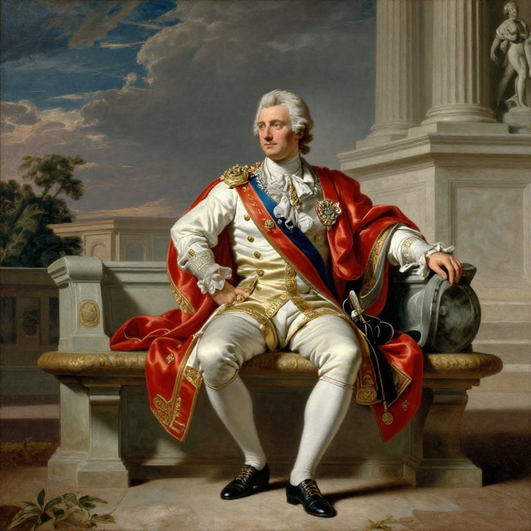 This is a digital painting of an 18th-century nobleman, depicted in a classical style. The man has powdered white hair, a fair complexion, and a composed expression. He wears a white waistcoat over a gold-trimmed shirt, with white breeches and black shoes. A red, gold-embroidered cape with a blue sash drapes over his shoulders. His right hand rests on a large, gray stone vase, while his left hand is on his knee. Behind him, a classical white column and a cloudy blue sky are visible. The background includes a stone balustrade and greenery. The overall composition exudes an air of regality and elegance.