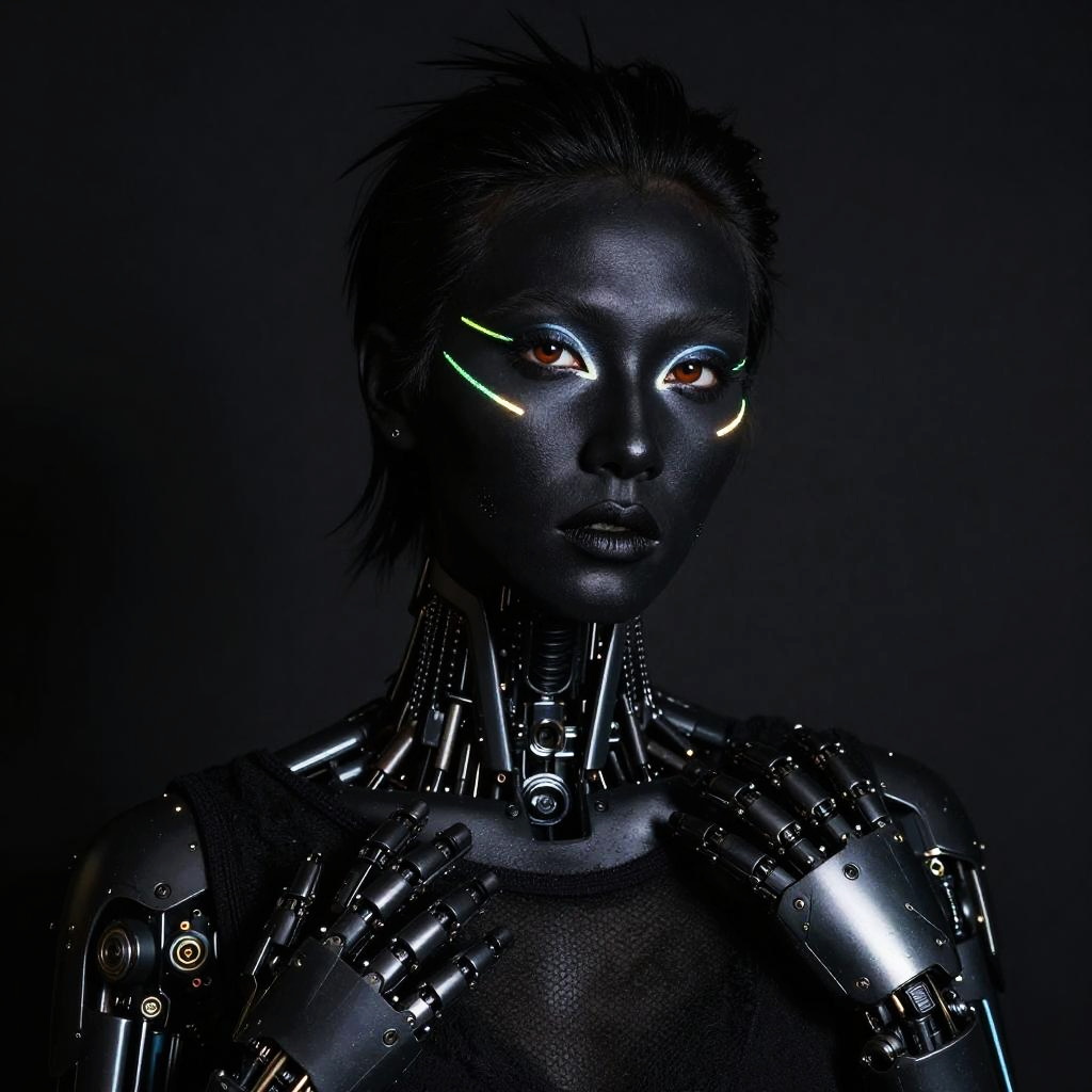 Black outfit makeup featuring avant-garde neon accents, contrasting black matte base, geometric eyeliner shapes, futuristic vibe, high contrast lighting, robotic fashion accessories