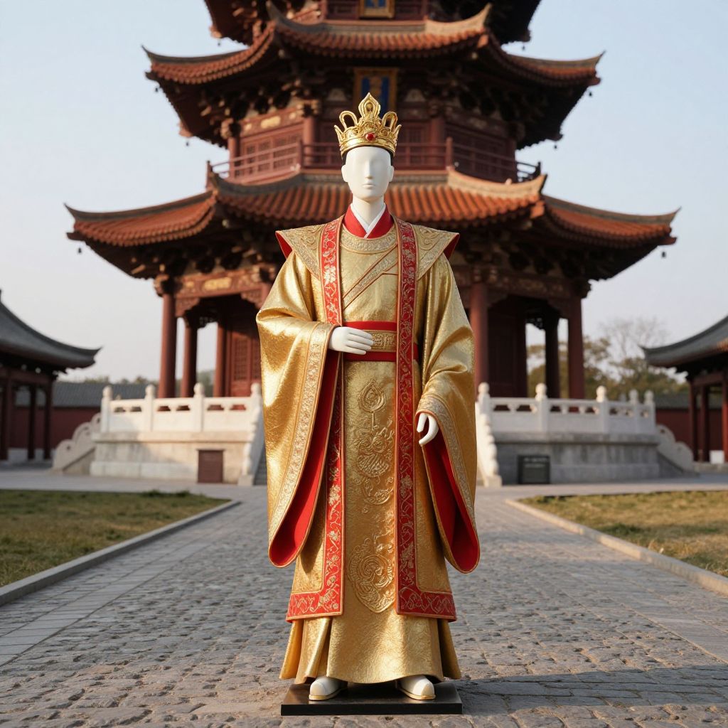 Photograph of a white mannequin in a gold and red royal robe with a golden crown, standing in front of a traditional Chinese pagoda.