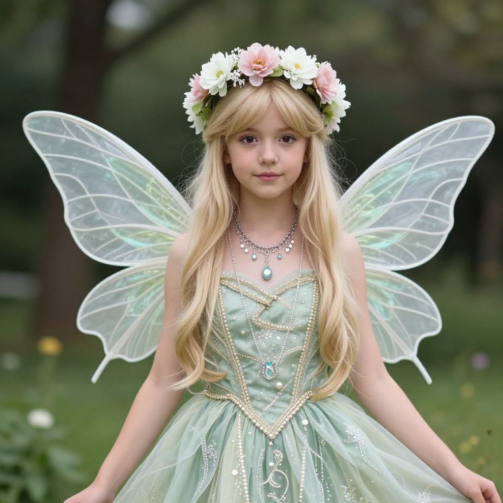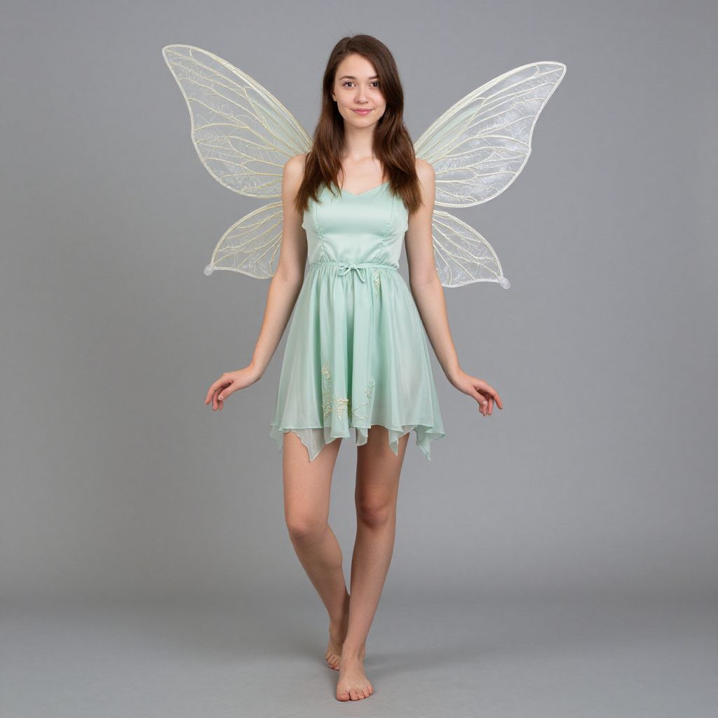 Fairy festival dress costume, 1girl, solo, wings, dress, hair ornament, pink dress, barefoot, full body, tree, brown hair, fairy wings, looking at viewer, standing, flower