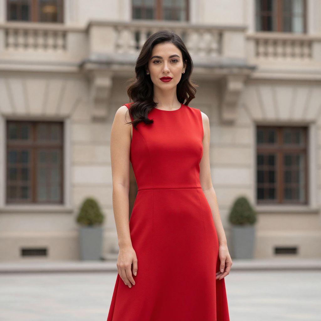 Photograph of a woman standing in front of a classical building with beige stone walls and large windows. She has long, wavy black hair, fair skin, and wears a sleeveless, floor-length red dress with a fitted bodice and flowing skirt. Her makeup is bold, with bright red lipstick matching her dress. She stands confidently with her arms relaxed at her sides. Two small, green, potted plants are positioned symmetrically in front of the building, flanking two large windows. The background is slightly blurred, focusing attention on the woman. The overall style is elegant and sophisticated.