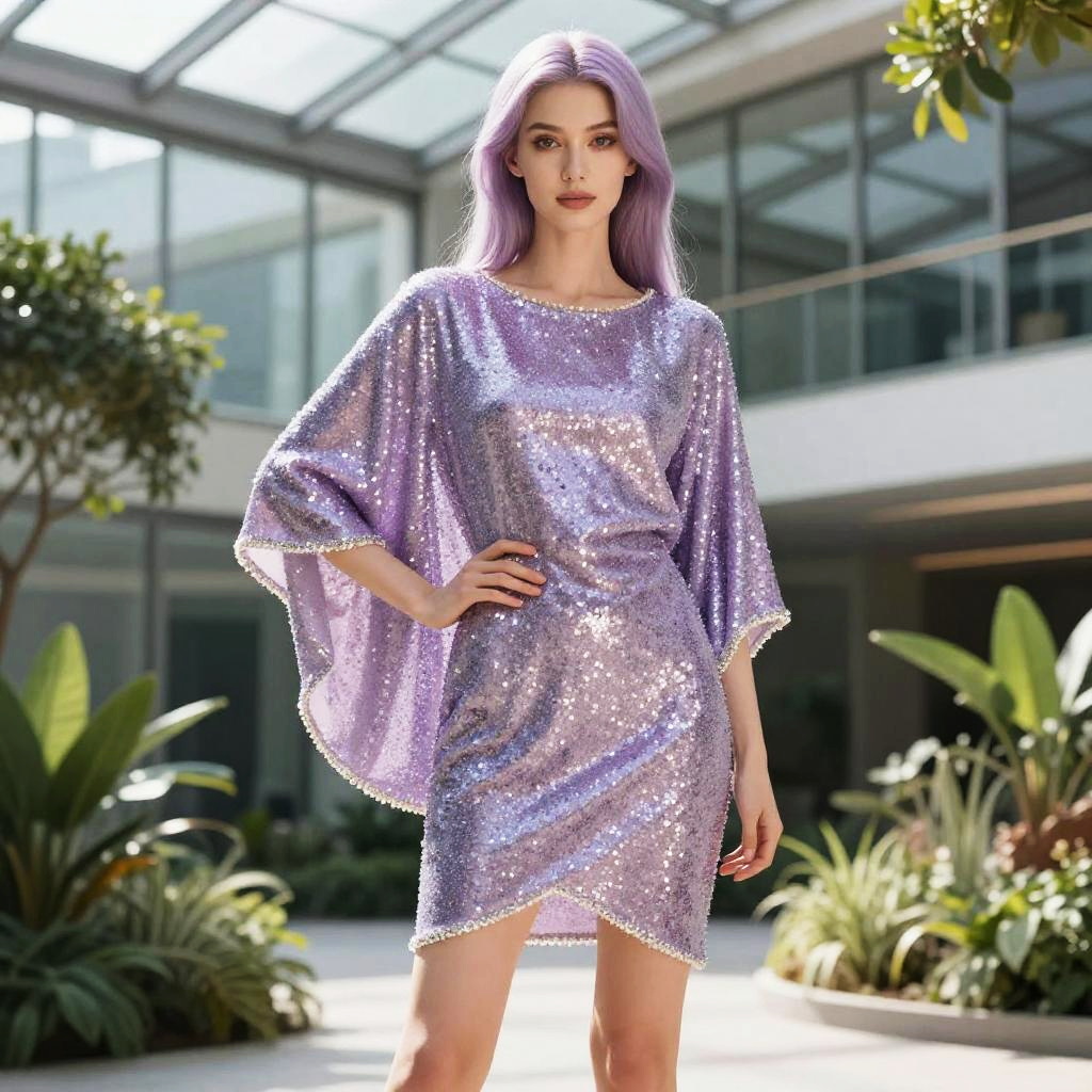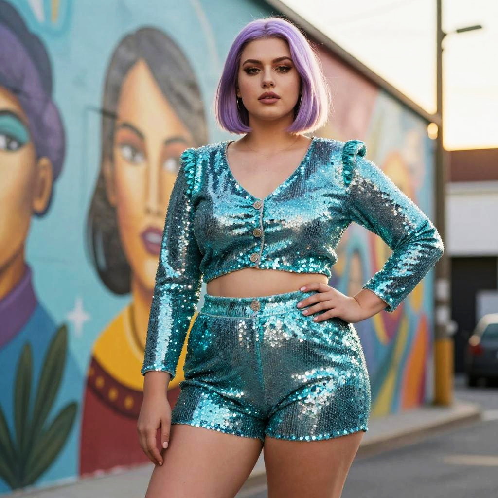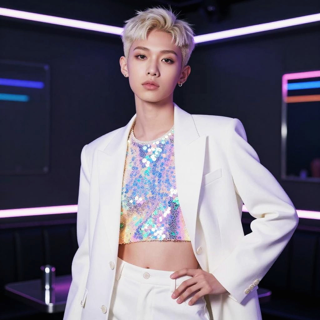 Fashion editorial portrait of mature female model with golden tan skin and short silver hair, wearing midnight navy jumpsuit with sequined bell sleeves and fitted waist. Set in modern art museum hall with minimalist architecture, sequins catching the light and crisp rim highlights. Confident stance, one hand on hip, direct gaze. Clean composition, shallow depth of field, refined styling, high-end finish, emphasis on texture and sparkle, chic and glamorous mood.
