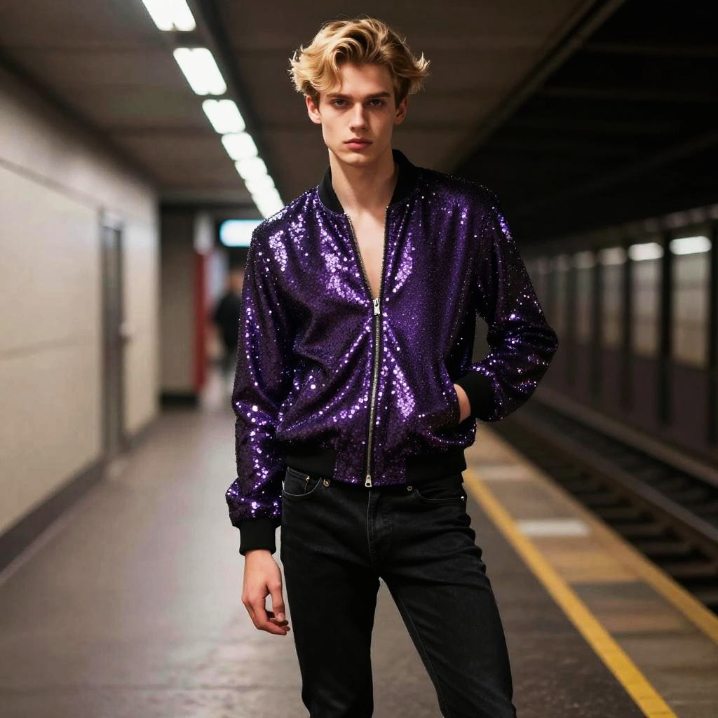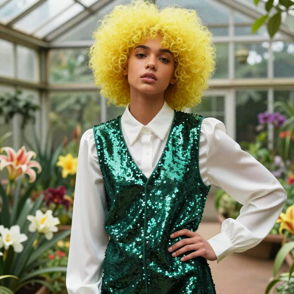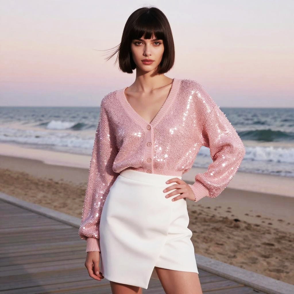 Fashion editorial portrait of mature female model with golden tan skin and short silver hair, wearing midnight navy jumpsuit with sequined bell sleeves and fitted waist. Set in modern art museum hall with minimalist architecture, sequins catching the light and crisp rim highlights. Confident stance, one hand on hip, direct gaze. Clean composition, shallow depth of field, refined styling, high-end finish, emphasis on texture and sparkle, chic and glamorous mood.