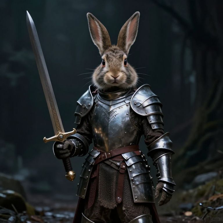 Digital artwork of a rabbit in medieval armor, holding a sword, standing in a dark, forested background. The rabbit's alert expression contrasts with the