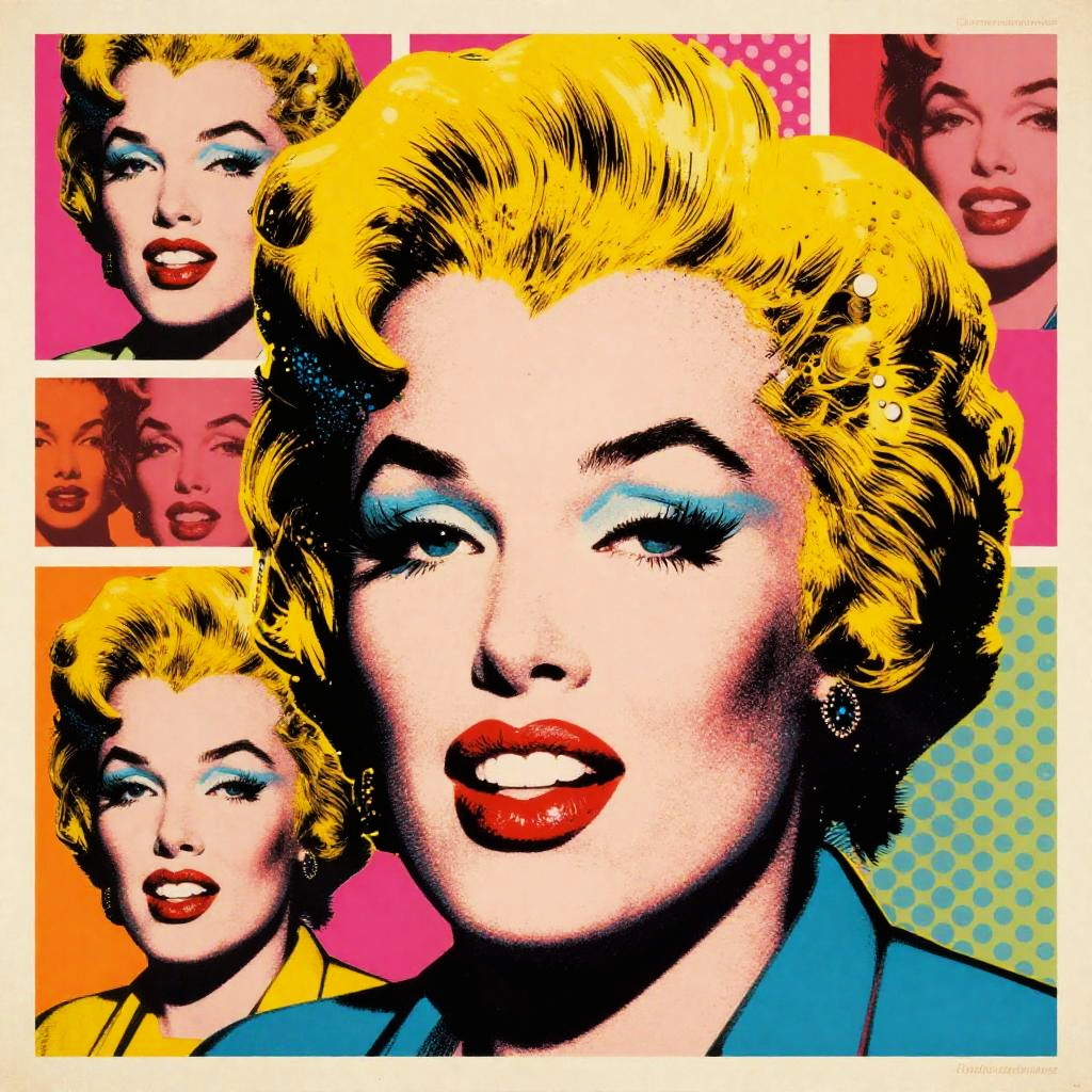 Realistic photo.Oil painting in the style of Andy Warhol, a fashion designer and a model, standing in front of a desk, discussing, pop art colors with bright pink and yellow highlights, soft lighting, warm and professional atmosphere. realistic photo