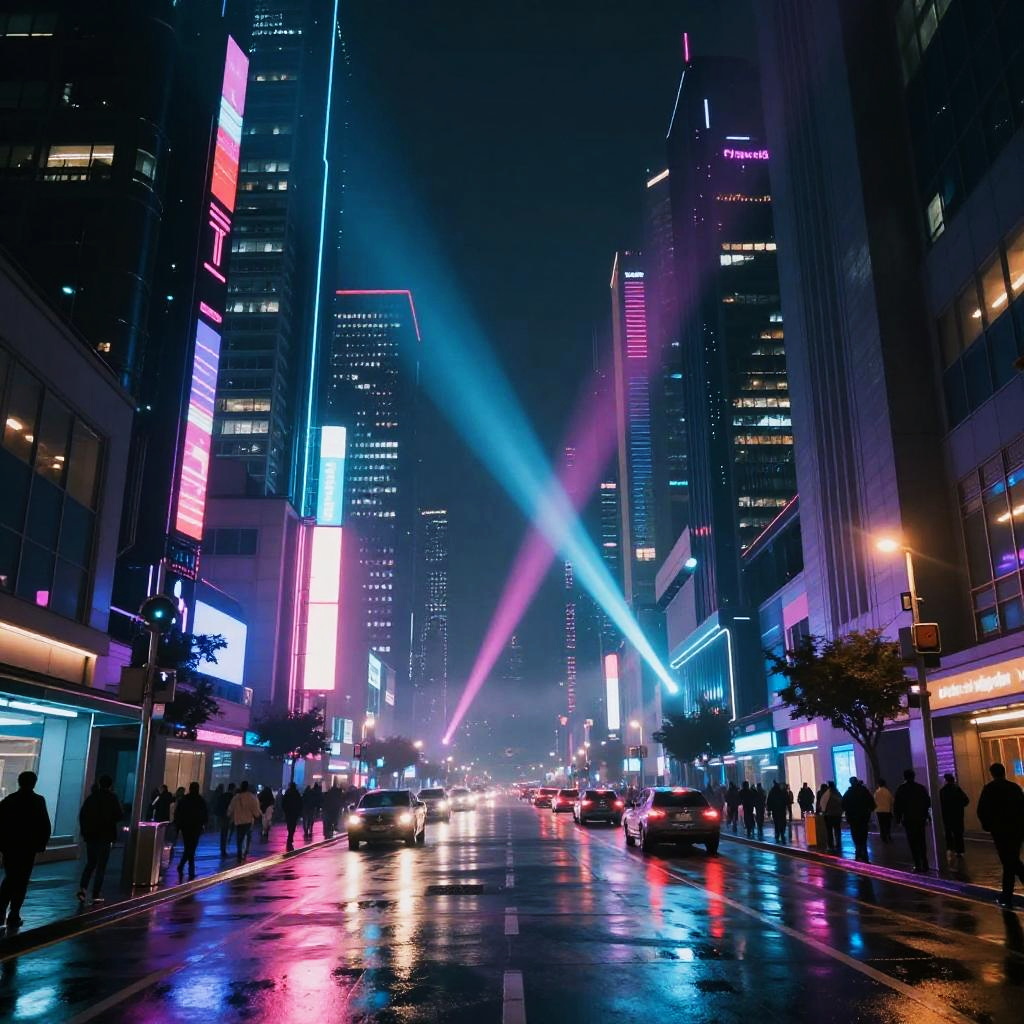 Strobe lights illuminating a futuristic cityscape at night, vibrant neon colors reflecting on wet streets, dynamic beams cutting through mist, cyberpunk atmosphere with sleek architecture and bustling crowd, high contrast and vivid glow effects.