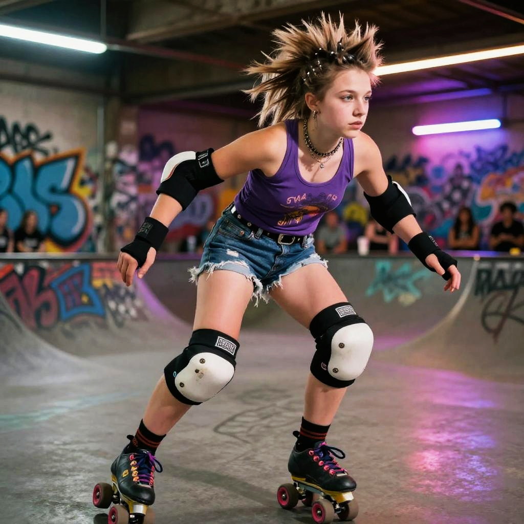 Avant-garde photography of a poised adult woman as a vinyl record DJ with short asymmetrical cut, dressed in a retro 70s inspired disco fashion featuring sequined jumpsuit and platform shoes. The setting includes a dimly lit vibrant nightclub, framed with colorful club lights and laser beams, and shot with a medium close-up with energy focus.
