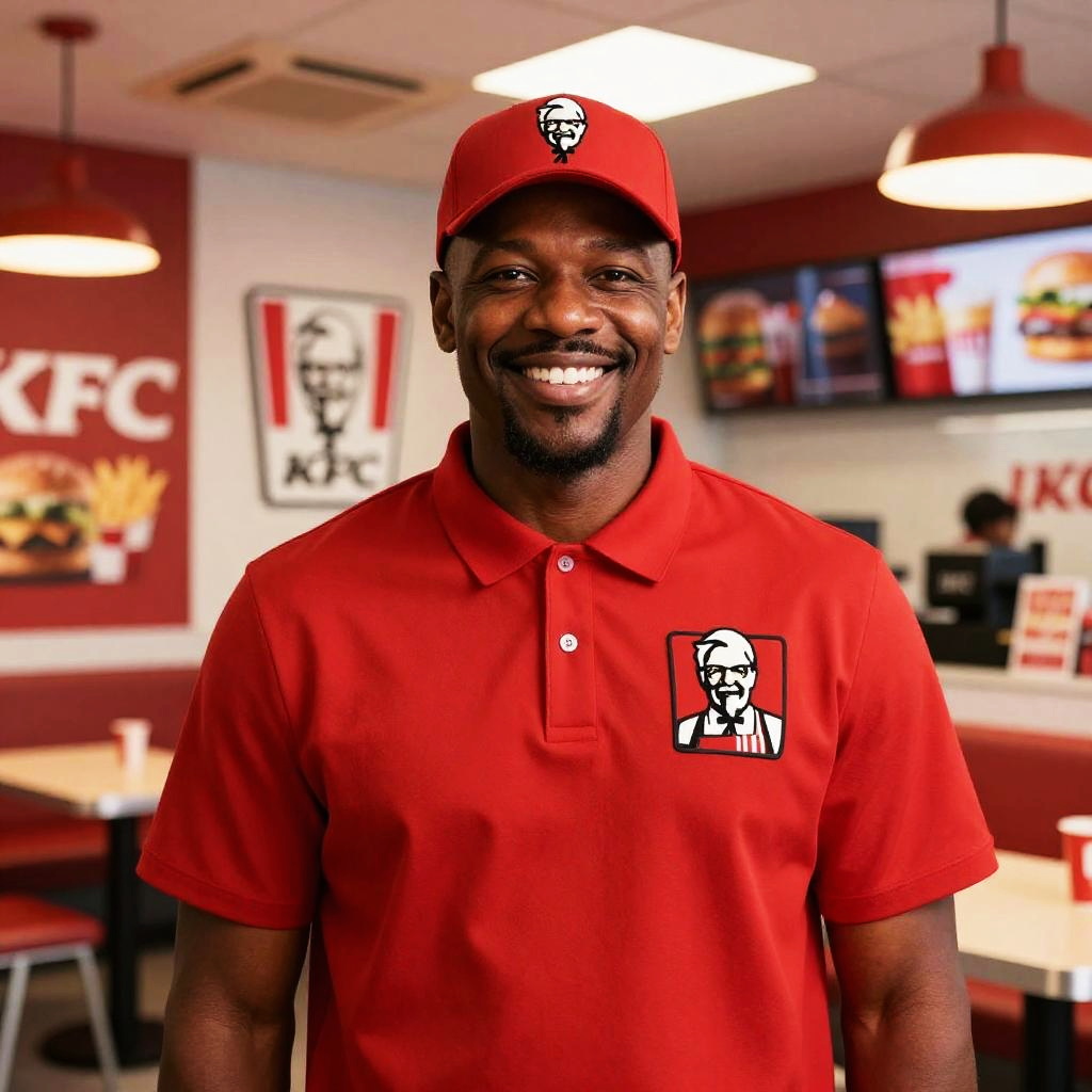 KFC black guy serving fries and chicken, casual urban background with bright signage, warm sunlight, detailed textures, a welcoming and energetic vibe, digital art