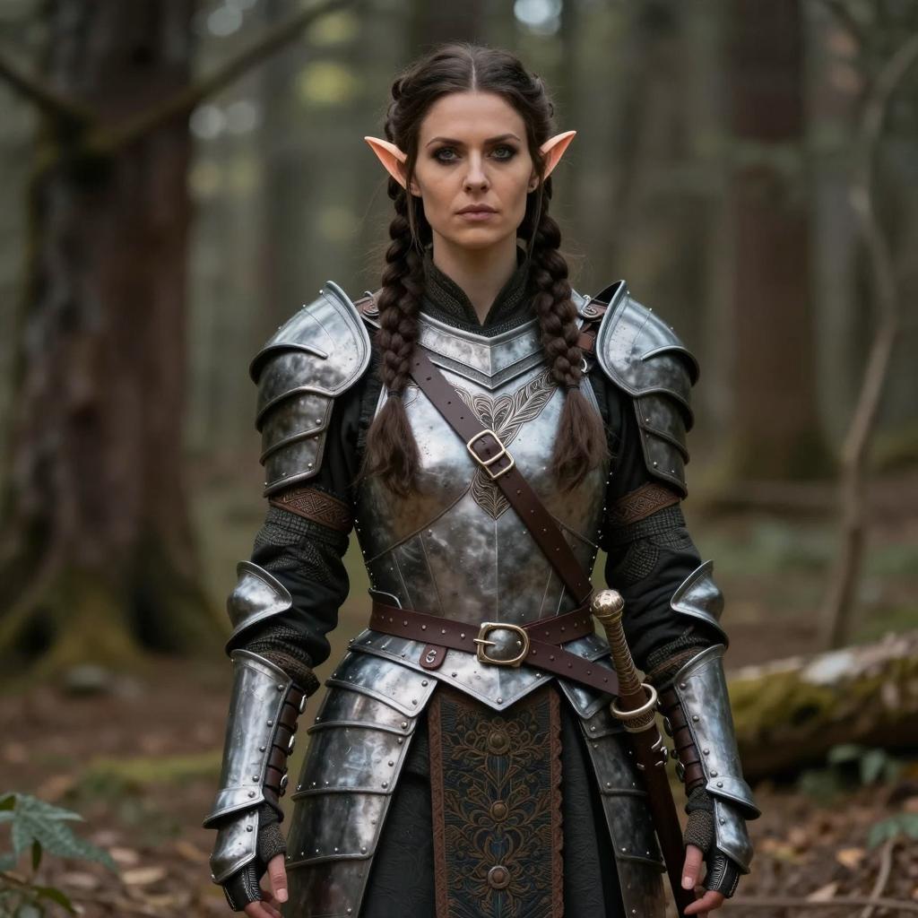A woman dressed in detailed fantasy warrior armor stands confidently in a natural forested setting. Her look is enhanced with pointed elf-like ears and braided dark hair, embodying a strong and mystical character inspired by medieval and fantasy aesthetics.