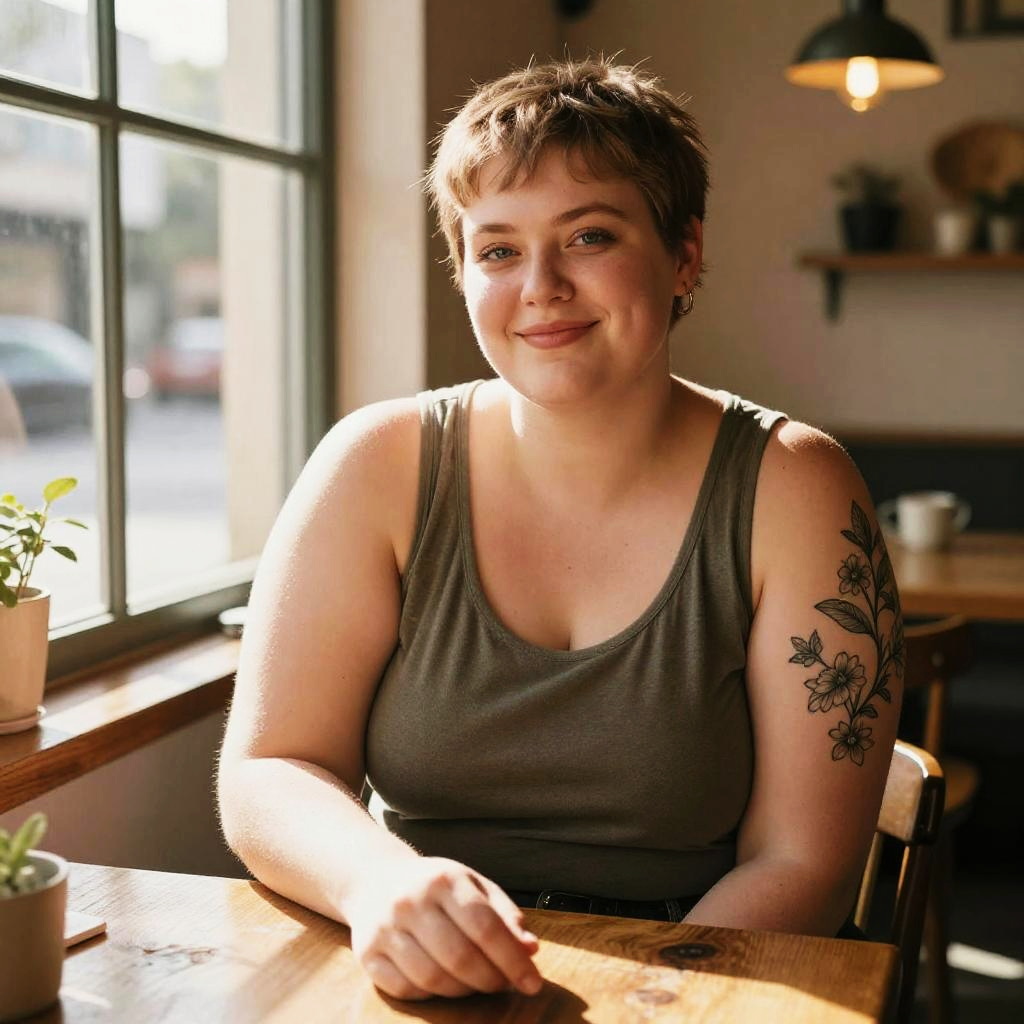 Portrait of BBW Scarlett in a cozy vintage room filled with warm tones, soft natural light streaming through the window, she wears a comfortable knit sweater and jeans, smiling gently, embodying comfort, confidence, and natural beauty with a serene atmosphere.