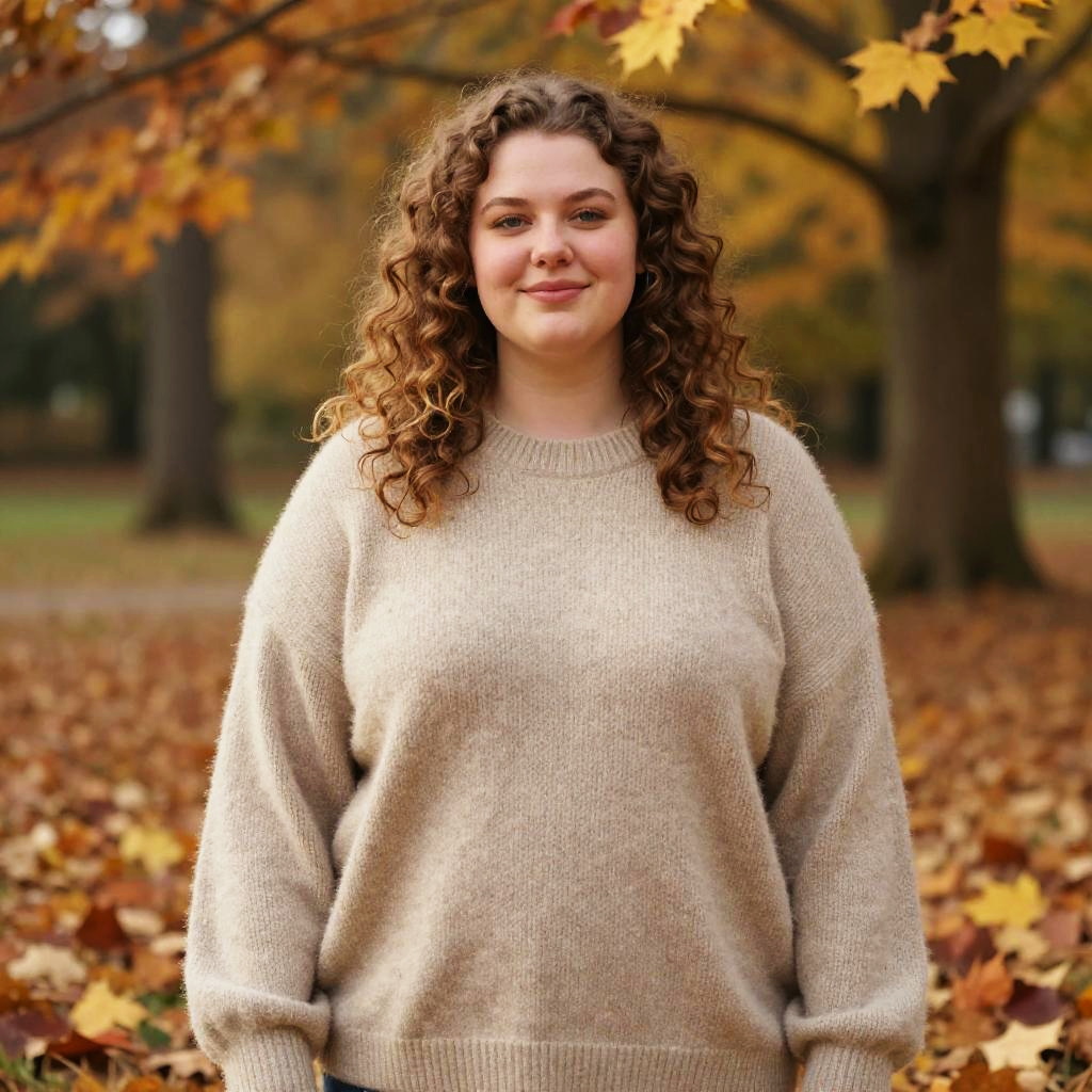 Photograph of a smiling, curvy woman with wavy brown hair, wearing a cream knit sweater and blue jeans, standing by a sunlit window
