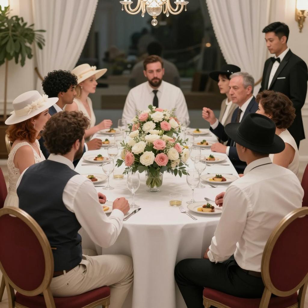A group of 11 men sits at a long table in a dimly lit room. A bearded older man in a dark suit stands at the head, gesturing with his right hand. The table is covered with a white cloth, scattered with bread, fruit, wine bottles, and glasses. The men wear formal attire with vests and ties, facing the standing man. Sunlight filters through a window in the background.