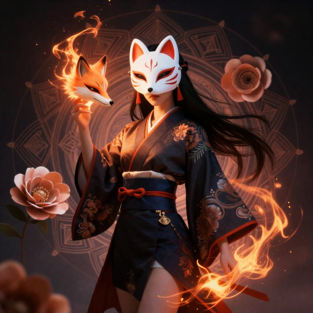 A photorealistic depiction of a Kitsune witch wearing a traditional haori jacket with floral patterns and a white fox mask. She holds a glowing fox head in one hand and conjures foxfire magic with the other. The background features an abstract mandala design and floating flowers, creating a fantastical and elegant atmosphere.