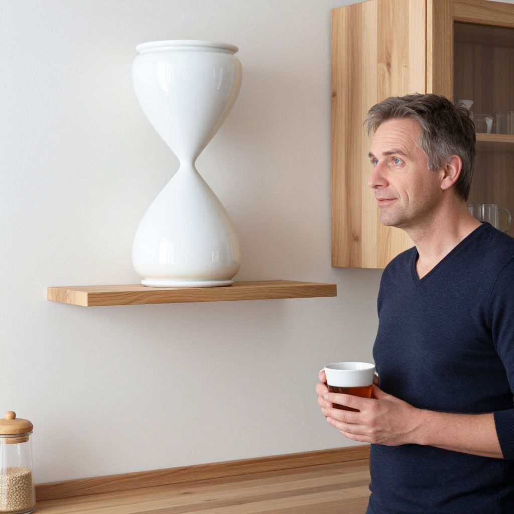 A Scandinavian-style kitchen with clean lines and natural wood finishes, featuring a large hourglass decor mounted on a wall beside a vintage wooden shelf. The hourglass is crafted from smooth white porcelain with a soft gradient in color. A man in his 40s with short gray hair and gentle blue eyes stands nearby, holding a mug of tea, watching the sand fall in stillness.