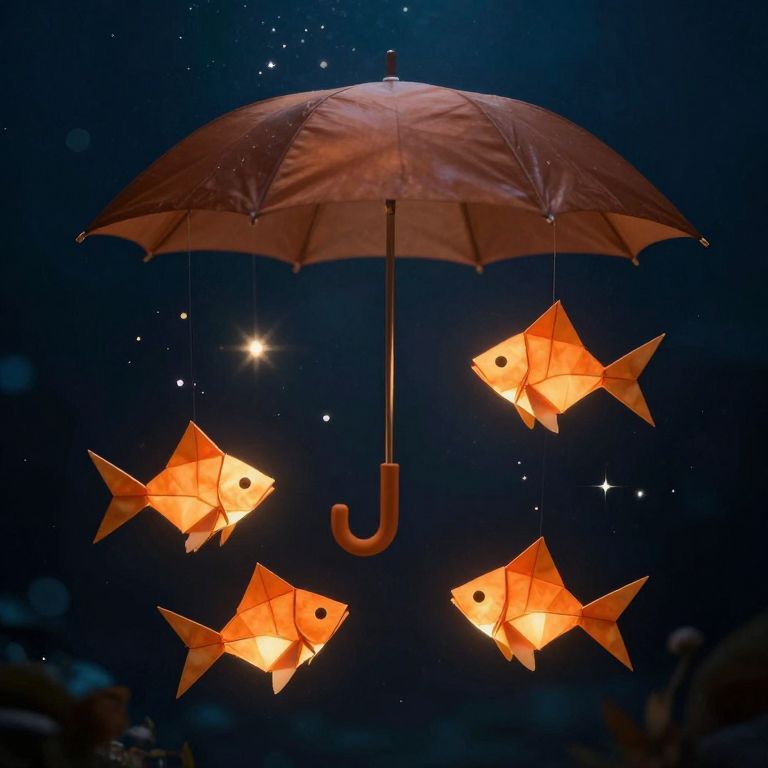 Glowing origami fish emerge from beneath an open brown umbrella, suspended underwater amidst liquid stardust, as three vibrant orange fish swim gracefully around it.
