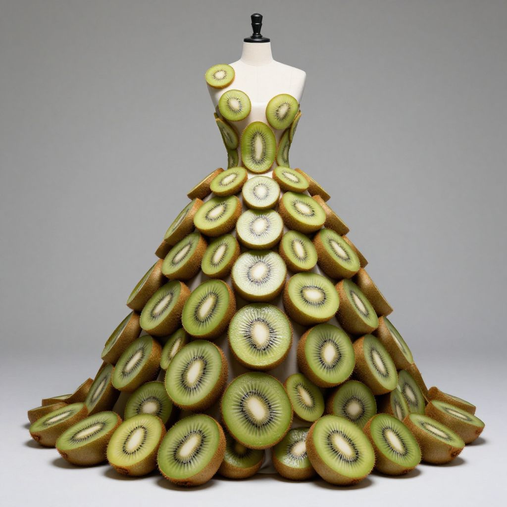 A surreal gown adorned with lifelike kiwi slices cascades elegantly from a mannequin, blending the organic textures of fruit with the structured artistry of fashion in a whimsical, otherworldly display.