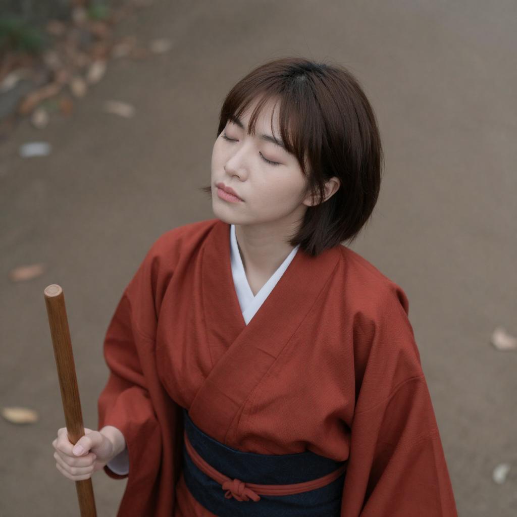 Asian woman with short brown hair, closed eyes, and serene expression, wearing a red kimono and holding a wooden staff, standing on a dirt path with scattered leaves. Overhead angle. Brown dirt path background.