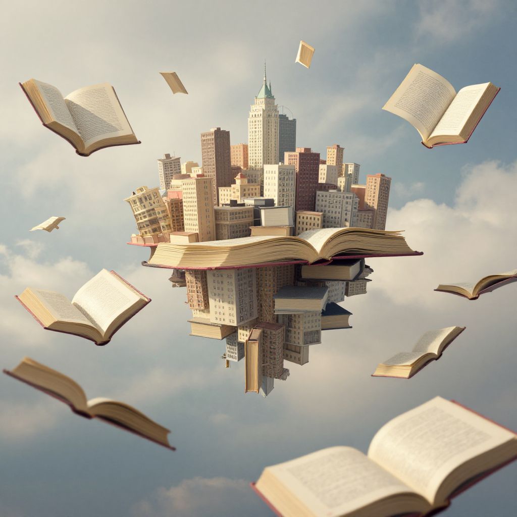 Children ride bicycles inside the folds of a giant, breathing book, their wheels tracing new narratives that never existed before.