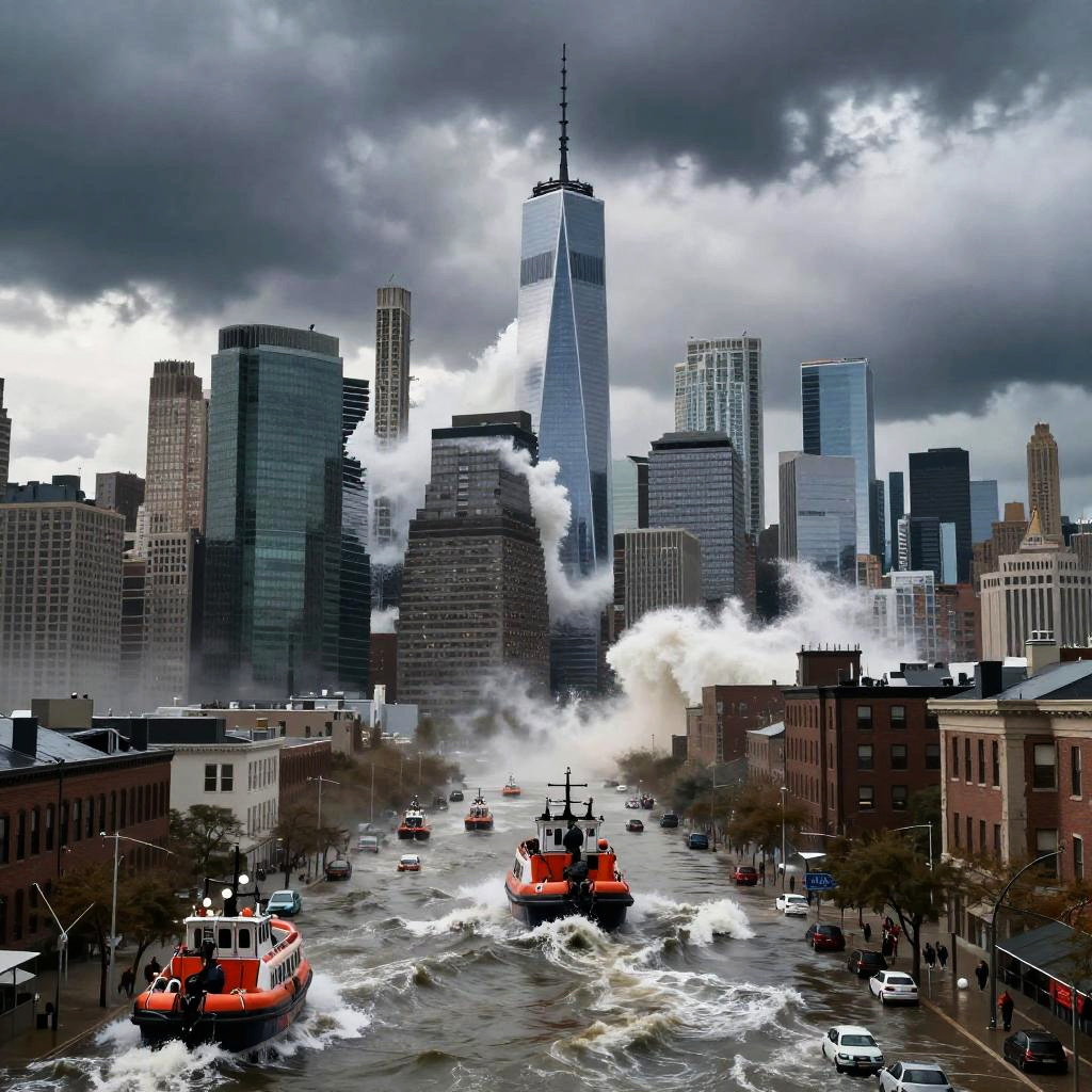 Tsunami NYC skyline devastated, massive ocean wave crashing into skyscrapers, dark stormy sky, chaotic urban flood, lifeboats navigating flooded streets, dramatic cinematic lighting, hyper-detailed photorealistic style