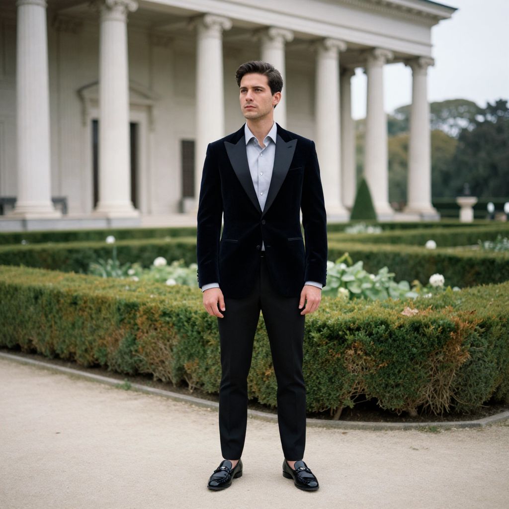 "a man, rich navy velvet dinner jacket, contrasting black satin lapels, light gray dress shirt, tailored black slim trousers, elegant black leather loafers, neoclassical façade, towering columns, manicured gardens, Holga camera style, soft focus, contemplative expression. Man has masculine face and piercing eyes"