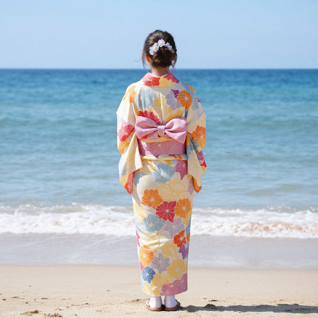 A woman in a colorful, patterned kimono stands on a beach, facing the ocean.