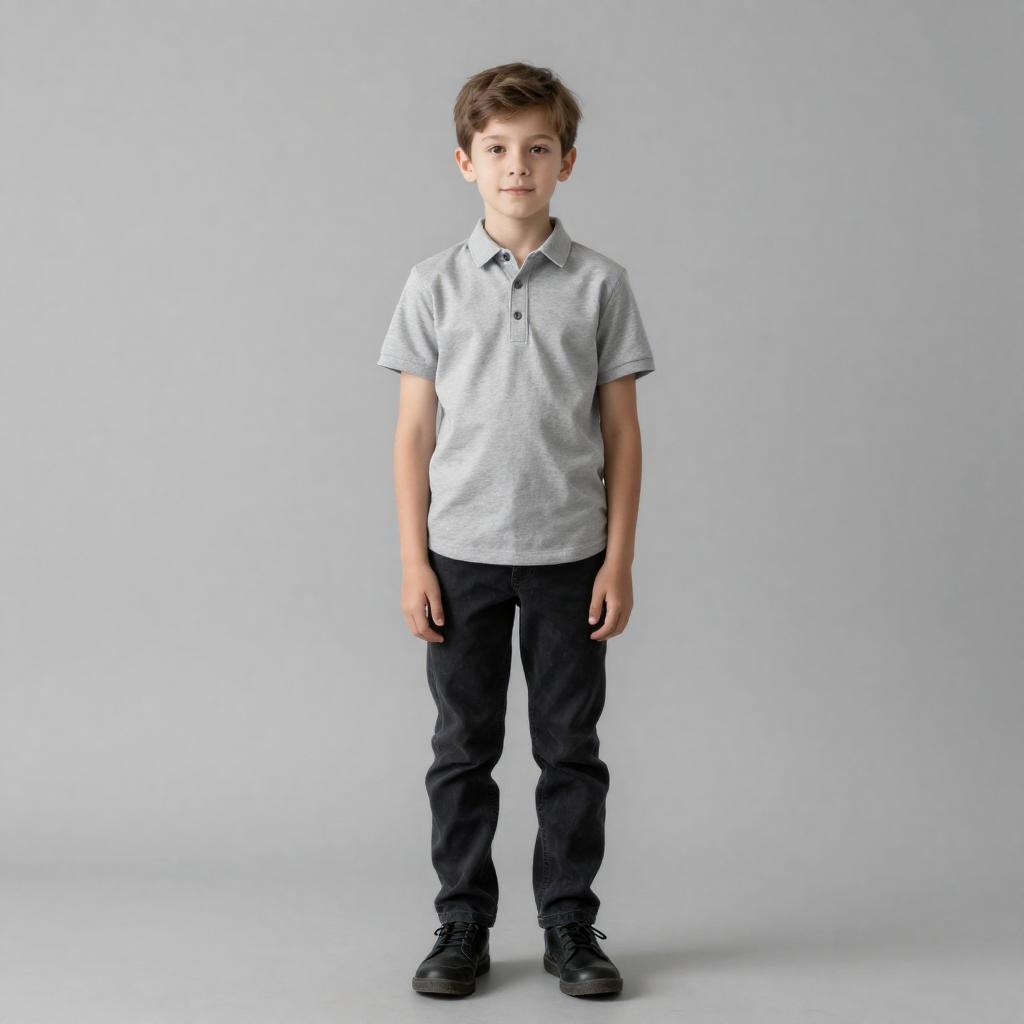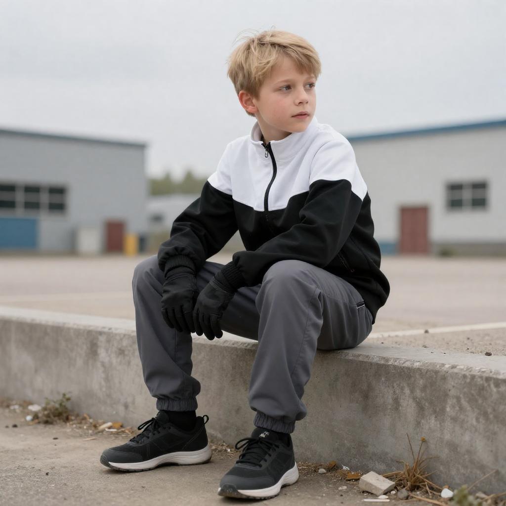 Young boy with short blonde hair, wearing black and white track jacket, gray pants, and black gloves, sitting on concrete edge, looking to the side, dirt and debris around, industrial buildings in background, overcast light.