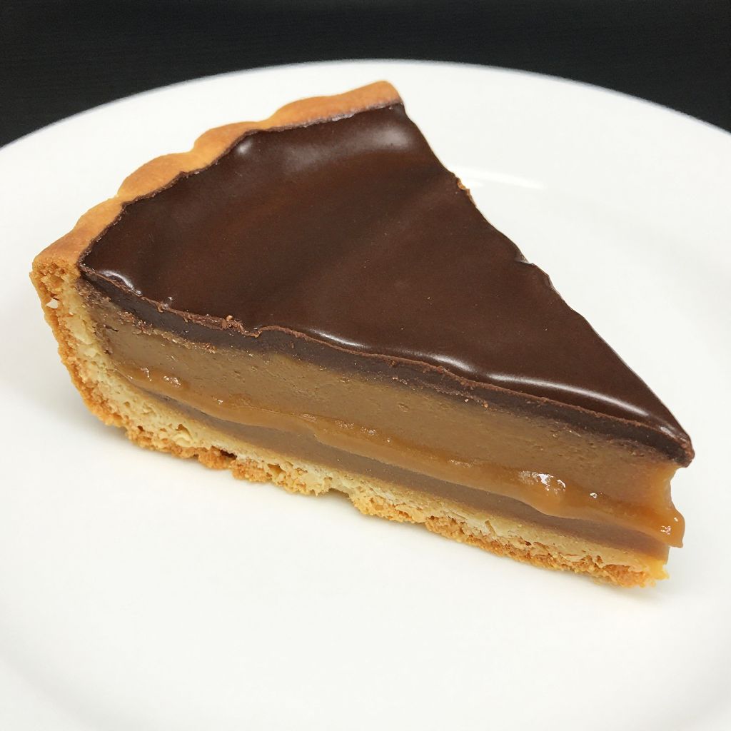 Sliced caramel tart featuring three distinct layers—topped with glossy chocolate ganache, filled with smooth caramel, and supported by a golden-brown biscuit base—rests elegantly on a pristine white plate.