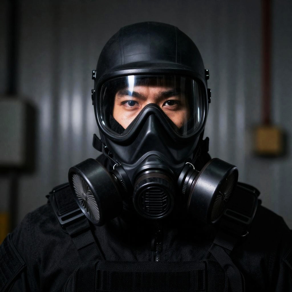 Person in black tactical gear wearing a black gas mask with a clear lens, reflecting a face in the lens. Dimly lit, industrial background with metallic ures. Close-up shot, upper body focus.