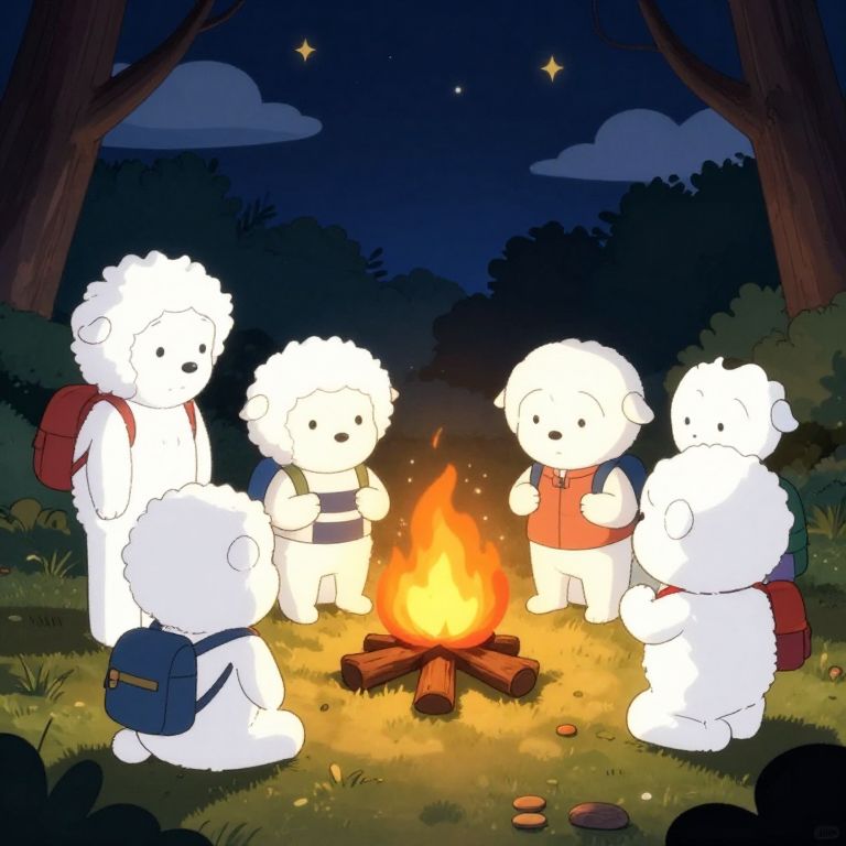 White cartoon characters with curly hair gathered around a cozy campfire at night, warm glowing light, expressive faces, colorful backpacks and casual clothing, forest backdrop, stylized clouds and stars, hand-drawn animation style, nostalgic feeling, magical realism touches.