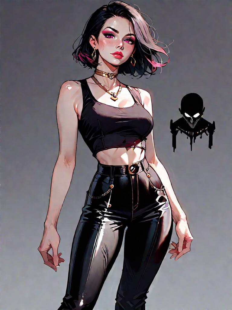 1girl, source_comics, realistic face, full body shot, Woman, edgy streetwear, black tank top with metallic lettering, scoop neck, sleeveless, paired with black faux-leather leggings, high waist, fitted silhouette, minimal gold choker necklace.